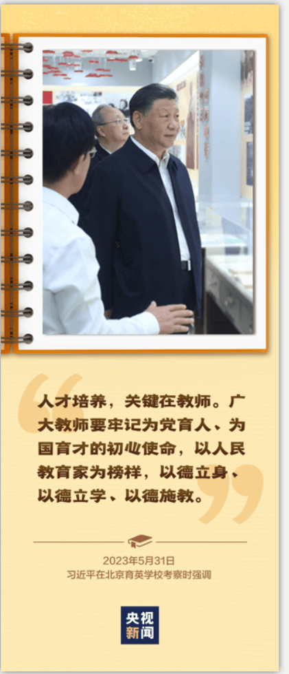 对于好老师,习近平总书记用言语、行动表达最深的敬意。 在回信中,总书记称赞河北保定学院西部支教毕业生“让青春之花绽放在祖国最需要的地方”。 2021年2月,全国脱贫攻坚总结表彰大会上,习近平总书记在讲话中称赞张桂梅“献身教育扶贫、点燃大山女孩希望”。 领奖台上,习近平总书记弯下腰,向坐在轮椅上的张桂梅郑重颁授了奖章。 “保重身体!”习近平总书记轻声对她说。 一声声温暖人心的问候,一封封情真意切的书信,体现了总书记对教师群体的深深敬意。 “好老师要做到 学为人师、行为世范” 如何做一名好老师呢? 在总书记看来,好老师没有统一的模式,可以各有千秋、各显身手,但有一些共同的、必不可少的特质。 “有理想信念、有道德情操、有扎实学识、有仁爱之心”,这是习近平心中好老师的四条标准。 第一,做好老师,要有理想信念。 2014年9月,习近平总书记来到北京师范大学,参观教师节主题展时,一张北师大早年一位毕业生公共课考试的成绩单格外引人注目,当听到负责人介绍说排在第一的公共课就是“人伦道德”,总书记转过身来,笑着对随行人员说,古人说“传道、授业、解惑”,教师职责第一位的就应该是“传道”。 一个老师,如果只知道“授业”“解惑”而不“传道”,不能说这个老师是完全称职的。习近平总书记强调,好老师心中要有国家和民族,要明确意识到肩负的国家使命和社会责任。 第二,做好老师,要有道德情操。 教师的职业特性决定了教师必须是道德高尚的人群。2018年5月,习近平总书记来到北京大学与师生座谈,又谈到好老师的话题。总书记表示,评价教师队伍素质的第一标准应该是师德师风。 今年5月,习近平总书记在北京育英学校考察时强调,广大教师要牢记为党育人、为国育才的初心使命,以人民教育家为榜样,以德立身、以德立学、以德施教。