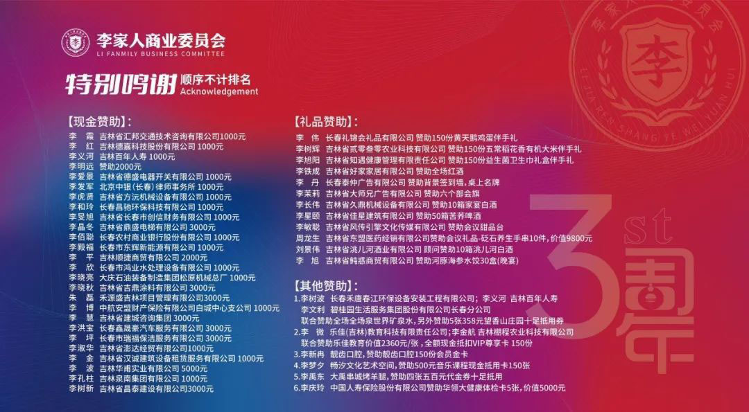 在大会的最后,主持人发表了李家人商业委员会未来发展的展望。积极发挥平台作用,推动李家人之间的商业交流与合作,努力为吉林省经济发展贡献力量。同时,委员会还将加强与政府、企业和社会组织的合作,共同为李家人创造更多的发展机会和空间。李家人所倡导的家族文化,不仅为企业发展提供了道德指导,也为员工提供了精神支持。李家人的领导力和创新理念,也将会在宗亲协会中独树一帜,他们将传统文化与现代管理相结合,形成了独特的企业运营模式。在未来的日子里,我们有理由相信,李家人将带领他们的企业,继续在吉林省乃至全球化的舞台上发挥巨大的影响力,不断推动商业文明的进步。同时,李家人也明白,商业的成功不仅仅是经济利益的追求,更是对社会责任的担当。他们将继续积极投身于公益事业,关注环境保护、教育发展和社区建设等方面,为社会做出更大的贡献。李家人将坚守诚信和公正的原则,以优秀的企业文化和经营理念,赢得社会的尊重和信任。
