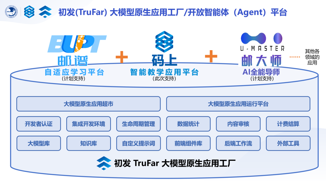 北京邮电大学推出的智链iLink大模型创新实践平台引导同学们基于大模型创新实践平台提供的模型工具资源和技术课程资源,认识AI、学习AI、运用AI。初发(TruFar)——大模型原生应用工厂/开放智能体平台支持教师和大学生开发者上传自己的知识库,支持自定义多轮回答的提示词,创新性地支持自定义前端界面+配套的自定义后端工作流的机制,全面助力大学生创新创业实践和拔尖创新人才培养工作。