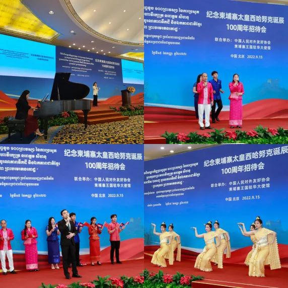 招待会上,与会嘉宾共同观看了外文局精心制作的中柬友好视频《金色的诺言》;中柬友好人士、留学生演唱了西哈努克太皇创作的歌曲《怀念中国》、《相逢在今晚》,北京外国语大学柬语专业学生表演柬传统舞蹈《南国红豆》,受到中外嘉宾一致好评。