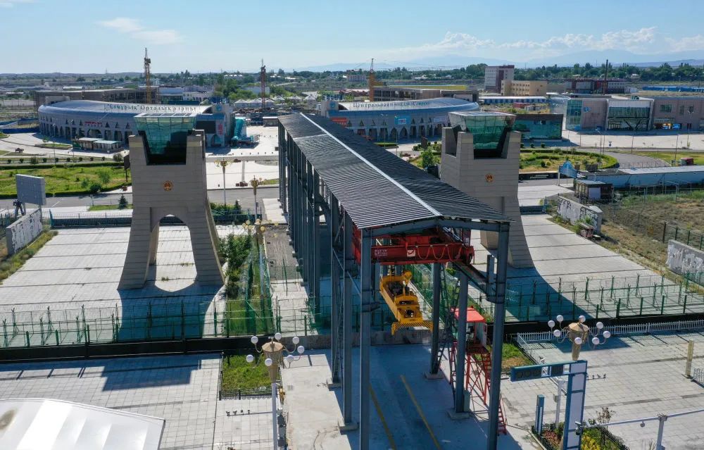 ▲ 中国新疆中哈霍尔果斯国际边境合作中心的“空中陆桥”(2021年6月15日摄)。中哈霍尔果斯国际边境合作中心搭建起“空中陆桥”,降低新冠肺炎疫情对跨境物流的影响。