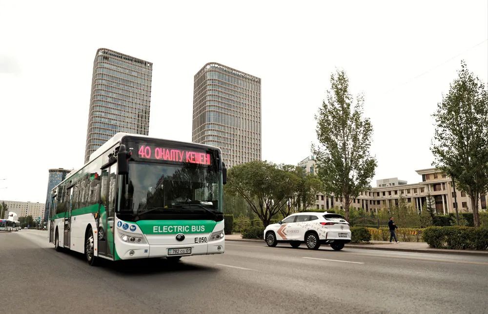 ▲ 宇通牌电动公交车行驶在哈萨克斯坦努尔苏丹的道路上(2022年9月10日摄)。中国宇通客车股份有限公司和哈萨克技术公司合资建设的CKD工厂生产纯电动客车及符合欧V排放标准的环保公交车。