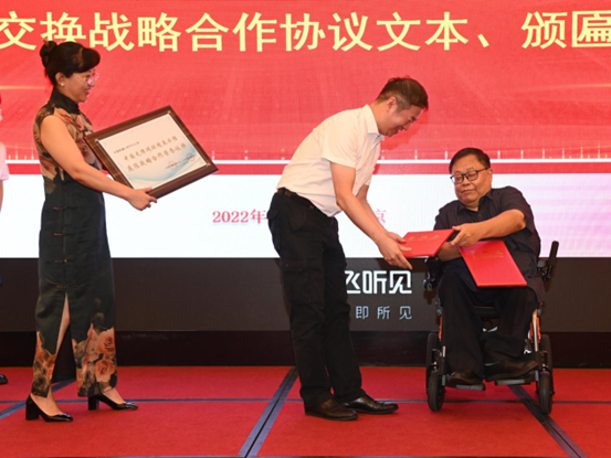 为推进中国无障碍文化艺术,彰显无障碍文明价值、人文情怀,活动现场中国残疾人特殊艺术指导中心主任李冬梅、中国文学艺术基金会熊猫艺术发展基金常务副主任兼秘书长徐大伟分别同中国助残志愿者协会会长吕世明互换战略合作协议文本。活动还发布了以《熊猫中中与导盲犬爱爱共享融合无障碍》水墨画为蓝本的国版明信片和国版邮资机宣传戳。