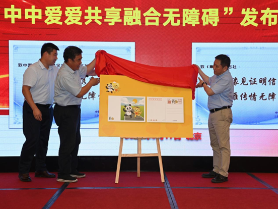 中国残联原副理事长相自成、中国文学艺术基金会副秘书长牛彤、中国残疾人事业新闻宣传促进会副秘书长杨聪为《中中爱爱携手无障碍》国版明信片发行揭幕