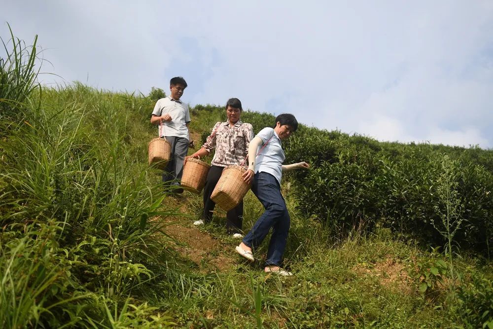 图为2022年9月22日,在广西苍梧县六堡镇山坪村,祝雪兰(前)和村民采茶后走下茶山。新华社记者 陆波岸/摄