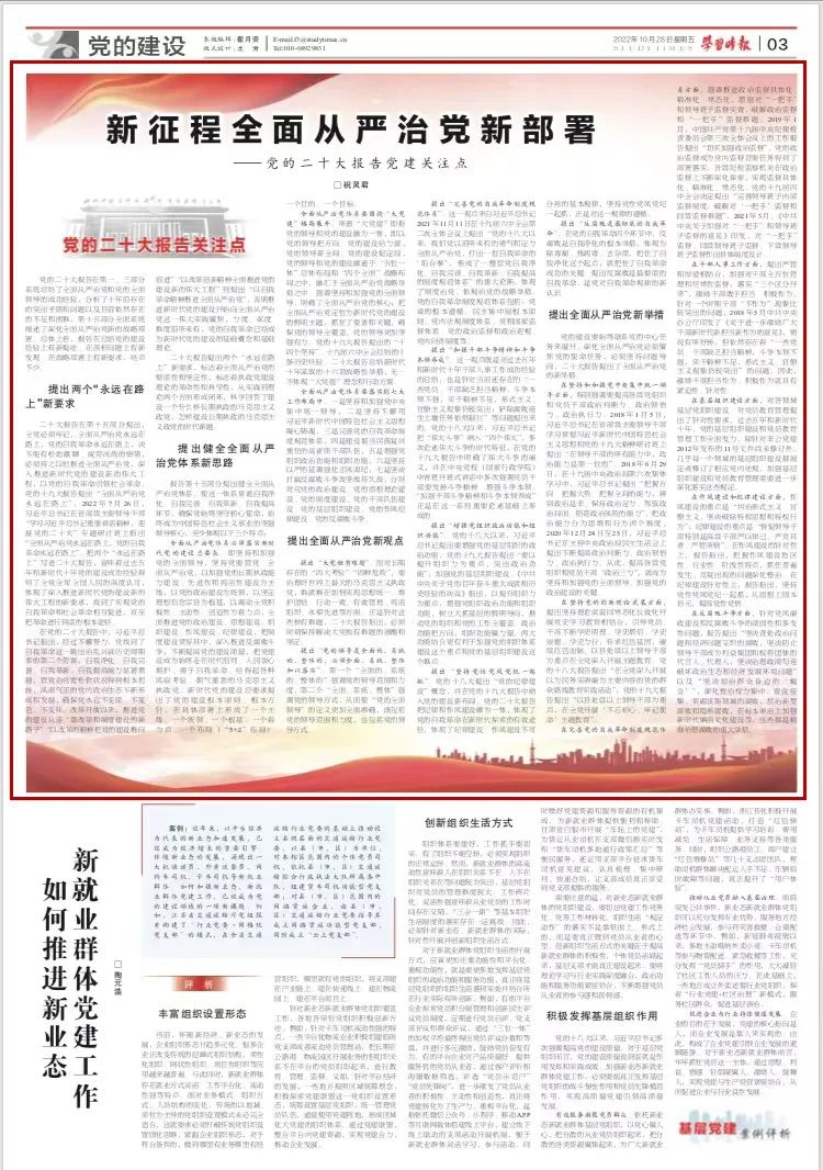 党的二十大报告在第一、三部分系统总结了全面从严治党和党的全面领导的成功经验,分析了十年前存在的突出矛盾和问题以及目前依然存在的不足和困难,第十五部分全面系统阐述了深化全面从严治党新的战略部署。总体上看,报告在总结党的建设经验上有新提法、在剖析问题上有新发现、在战略部署上有新要求,亮点不少。