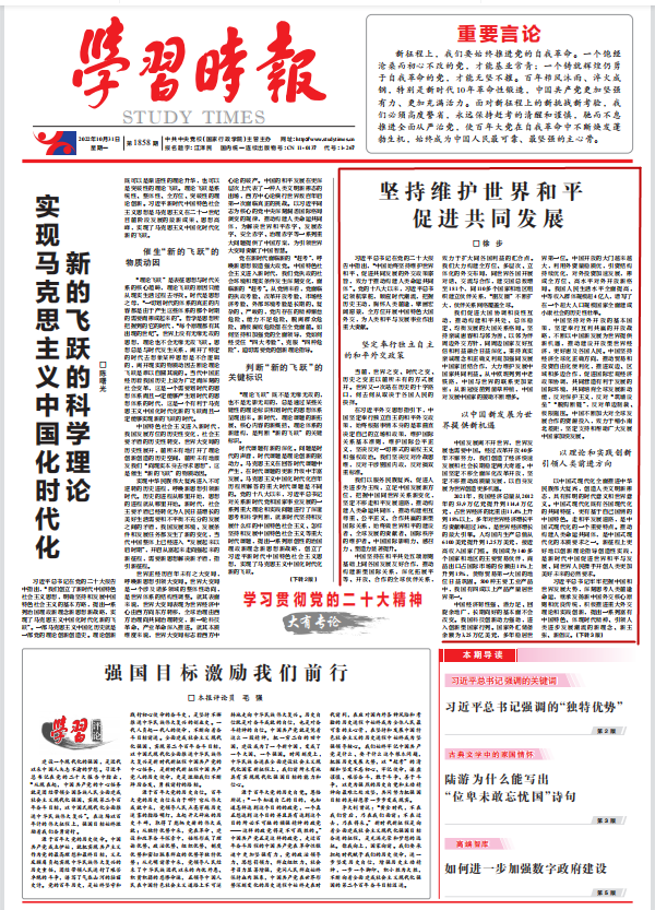 以中国式现代化全面推进中华民族伟大复兴,创造人类文明新形态,具有鲜明的时代意义和世界意义。中国式现代化既有各国现代化的共同特征,更有基于自己国情的中国特色。走和平发展道路,是中国式现代化的一个重要特点。推动构建人类命运共同体,是中国式现代化的本质要求之一。新征程上更好地以创新理论指导创造性实践,是新时代中国促进世界和平与发展、同世界人民携手开创人类更加美好未来的必然要求。