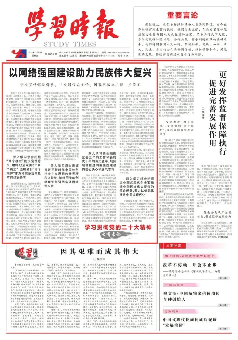 深入学习领会把握“两个确立”的决定性意义,始终把坚定拥护“两个确立”、坚决做到“两个维护”作为网信系统最根本的政治要求 沧海横流显砥柱,万山磅礴看主峰。深入学习领会党的二十大精神,最强烈最突出最深切的感受就是对“两个确立”的决定性意义有了更加深刻的认识。进入新时代,党和国家面临的形势之复杂、斗争之严峻、改革发展稳定任务之艰巨世所罕见、史所罕见。正是因为确立了习近平同志党中央的核心、全党的核心地位,确立了习近平新时代中国特色社会主义思想的指导地位,党才有力解决了影响党长期执政、国家长治久安、人民幸福安康的突出矛盾和问题,消除了党、国家、军队内部存在的严重隐患,从根本上确保实现中华民族伟大复兴进入了不可逆转的历史进程。“两个确立”是党在新时代取得的重大政治成果,是推动党和国家事业取得历史性成就、发生历史性变革的决定性因素,已经成为全党全军全国各族人民的高度共识和共同意志,已经写在了新时代的伟大征程中、写在了全党全军全国各族人民心坎上,是党战胜一切艰难险阻、应对一切不确定性的最大确定性、最大底气、最大保证。 面向新时代新征程,我们要深刻领悟习近平总书记关于“互联网管理是一项政治性极强的工作,讲政治是对网信部门第一位的要求”的重要指示精神,牢牢把握网信工作显著的政治特征和网信部门鲜明的政治属性,坚定不移把“两个确立”作为最执着的政治信念、最深刻的政治领悟、最坚定的政治立场、最重要的政治原则,深刻领悟“两个确立”的决定性意义,牢记“国之大者”,增强“四个意识”、坚定“四个自信”、做到“两个维护”,不断提高政治判断力、政治领悟力、政治执行力,始终在思想上政治上行动上同以习近平同志为核心的党中央保持高度一致,不折不扣贯彻落实习近平总书记重要指示批示精神和党中央决策部署,确保网信事业始终沿着正确政治方向和道路前进。 深入学习领会把握习近平新时代中国特色社会主义思想的世界观和方法论,始终用党的创新理论指引网络强国建设实践 理论引领时代,思想照亮航程。党的二十大报告对开辟马克思主义中国化时代化新境界进行集中阐述,深刻阐释了“两个结合”,明确提出了“六个坚持”,深刻阐述了习近平新时代中国特色社会主义思想的世界观和方法论,标志着我们党推进马克思主义中国化时代化达到了新的境界。党的十八大以来,习近平总书记立足信息化发展大势和国内国际大局,系统回答了为什么要建设网络强国、怎样建设网络强国的一系列重大理论和实践问题,形成了内涵丰富、科学系统的习近平总书记关于网络强国的重要思想。这一重要思想坚持马克思主义立场观点方法,彰显着“两个结合”的理论品格、贯穿着“六个坚持”的鲜明特质,体现了马克思主义中国化时代化的内在要求,是信息时代的马克思主义,是习近平新时代中国特色社会主义思想的“网络篇”。这一重要思想指引网络强国建设攻坚克难、行稳致远、阔步前进,展现出耀眼的真理光芒和强大的实践力量。 面向新时代新征程,我们要深入学习贯彻习近平新时代中国特色社会主义思想特别是习近平总书记关于网络强国的重要思想,深刻领会党的创新理论的道理学理哲理,全面把握其世界观和方法论,坚持好、运用好贯穿其中的立场观点方法,尤其是深刻领会“两个结合”“六个坚持”的核心要义和基本要求,做到知其言更知其义、知其然更知其所以然,切实将党的创新理论贯彻落实到网信工作各方面全过程,推动思想伟力转化为加快推进网络强国建设的巨大实践动力。 深入学习领会把握过去五年的工作和新时代十年的伟大变革,切实增强推进网络强国建设的信心决心和底气志气 历史昭示未来,奋斗铸就辉煌。党的十八大以来,以习近平同志为核心的党中央团结带领全党全国各族人民,攻克了许多长期没有解决的难题,办成了许多事关长远的大事要事,创造了彪炳史册、举世瞩目的伟大成就,谱写了气壮山河、震古烁今的盛世华章。我们身处网信战线,对此有着深切体会。网信事业是在习近平总书记亲自擘画、亲自指导和亲自推动下开创的,因新时代而兴,与新时代同行。党的十八大以来,党中央成立中央网络安全和信息化领导小组(后改为委员会),明确提出建设网络强国的战略目标,召开党的历史上首次全国网络安全和信息化工作会议,统筹谋划和推进网络安全和信息化工作,采取一系列战略性举措、推进一系列变革性实践、实现一系列突破性进展、取得一系列标志性成果。历经十年奋斗,网络意识形态主阵地更加巩固,网络综合治理体系建设加快推进,网络安全保障能力全面提升,信息化驱动引领作用充分发挥,网络空间法治化进程不断加快,网络空间国际合作深化拓展,我国正从网络大国向网络强国阔步迈进。可以说,网信事业从无到有、从小到大、从弱到强,正是新时代十年伟大变革的真实写照和生动缩影。新时代网信事业取得历史性成就、发生历史性变革,根本在于以习近平同志为核心的党中央的坚强领导,根本在于习近平新时代中国特色社会主义思想特别是习近平总书记关于网络强国的重要思想的科学指引,这是我们做好网信工作最大的信心决心和底气动力。 面向新时代新征程,我们要坚定历史