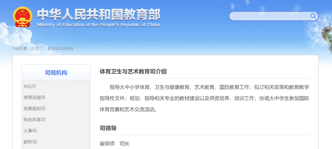 10月8日,教育部官网更新,崔保师担任教育部体育卫生与艺术教育司司长一职。