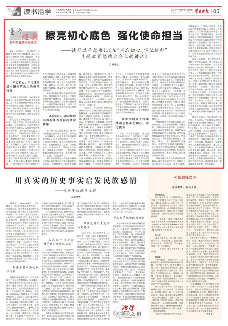 擦亮初心底色 强化使命担当 ——读习近平总书记《在“不忘初心、牢记使命”主题教育总结大会上的讲话》 《在“不忘初心、牢记使命”主题教育总结大会上的讲话》是习近平总书记2020年1月8日的讲话,收录在《十九大以来重要文献选编》中册。这篇重要文献从新时代党和国家事业发展全局的战略高度,深刻总结主题教育取得的主要成效、积累的成功经验,为新时代深化党的自我革命、推动全面从严治党向纵深发展,提供了根本指针和强大动力。 不忘初心、牢记使命是中国共产党人的鲜明特质 为中国人民谋幸福,为中华民族谋复兴,是中国共产党人的初心和使命。这一初心和使命集中体现了中国共产党的性质宗旨、理想信念、奋斗目标,是中国共产党的政治灵魂所系、政治生命所在,是激励一代代中国共产党人前赴后继、英勇奋斗的根本动力。 初心是建党时的出发点,是与生俱来、不能改变的;使命是初心的外在体现,在不同时代、不同历史阶段有不同的实践要求。从艰苦卓绝的革命战争年代,到中国特色社会主义进入新时代,党的历史是一部践行初心使命的历史。我们党秉持初心使命,紧紧依靠人民,夺取新民主主义革命伟大胜利,实现了民族独立、人民解放;完成社会主义革命和推进社会主义建设,实现了一穷二白、人口众多的东方大国大步迈进社会主义社会的伟大飞跃;进行改革开放和社会主义现代化建设,实现了人民生活从温饱不足到总体小康、奔向全面小康的历史性跨越;开创中国特色社会主义新时代,中华民族迎来了从站起来、富起来到强起来的伟大飞跃。正如习近平总书记指出,“从石库门到天安门,从兴业路到复兴路,我们党近百年来所付出的一切努力、进行的一切斗争、作出的一切牺牲,都是为了人民幸福和民族复兴”。 正是因为我们党始终牢记初心和使命,自觉践行初心和使命,才能在困顿逆境中毅然奋起,才能在近代以来各种政治力量的反复较量中脱颖而出,才能在领导中国革命、建设、改革的历史进程中始终成为中国人民和中华民族的主心骨。 不忘初心、牢记使命必须有强烈的自我革命精神 坚守为中国人民谋幸福、为中华民族谋复兴这个初心和使命,并不是一件容易的事,必须有强烈的自我革命精神。习近平总书记指出,“一个马克思主义政党,要保持先进性和纯洁性,实现崇高使命,必须‘以补过为心,以求过为急,以能改其过为善,以得闻其过为明’,一刻不放松地解决自身存在的问题,始终跟上时代、实践、人民的要求”。 强大的政党是在自我革命中锻造出来的。我们党历经百年沧桑更加充满活力,其奥秘就在于始终坚持真理、修正错误。回顾党的历史,我们党总是在推动社会革命的同时,勇于推动自我革命。面对各个历史时期的风险考验,我们党坚持刀刃向内,坚决同一切弱化党的先进性、损害党的纯洁性的问题作斗争,以自身的始终过硬,带领人民进行伟大社会革命,创造历史伟业。党在自我革命淬炼中不断增强的政治领导力、思想引领力、群众组织力、社会号召力,是党领导人民实现中华民族伟大复兴的底气所在、力量所在。 不忘初心、牢记使命,说到底是要解决党内存在的违背初心和使命的各种问题,关键是要有正视问题的自觉和刀刃向内的勇气。自我革命之难,难就难在刀刃向内,敢于向自己开刀,自觉触动自己的奶酪,攻克体制机制上的顽瘴痼疾,突破利益固化的藩篱。因此,自身既是变革的主体,也是变革的对象,要敢于直面自身存在的矛盾,革除自身的问题和不足,不断发展和完善自己。 当前,世界百年未有之大变局加速演进,中华民族伟大复兴进入关键时期。新征程上,我们既面临难得的发展机遇,也面临许多严峻复杂的风险和挑战,改革发展稳定任务之重、矛盾风险挑战之多、治国理政考验之大都前所未有。比如,全球动荡源和风险点增多,我国外部环境复杂严峻,改革发展稳定任务艰巨繁重,人民美好生活需要日益广泛,人民群众有着更新更高的期待。“赶考”远未结束,全党任重道远。如何永葆先进性和纯洁性、实现长期执政,成为我们党必须解决好的根本性问题。面对这样的形势,如果我们满足于已有的成绩,陶醉于别人的喝彩声、赞扬声,丧失革命精神和斗志,最终将会使党和人民事业功亏一篑。必须树立“船到中流浪更急,人到半山路更陡”的忧患意识和进取精神,越是环境复杂、任务艰巨,越不能忘记中国共产党人的初心和使命,越要有勇于自我革命精神,越要有正视问题的自觉和刀刃向内的勇气。 在新的起点上持续推动全党不忘初心、牢记使命 党的二十大报告强调,“全党同志务必不忘初心、牢记使命”。新征程上,我们要学习和践行伟大建党精神,更加坚定、更加自觉地牢记初心使命,谱写新时代中国特色社会主义更加绚丽的华章。 用习近平新时代中国特色社会主义思想武装全党。中国共产党人的初心,不仅来自于对人民的朴素感情、对真理的执着追求,更建立在马克思主义的科学理论之上。只有坚持思想建党、理论强党,不忘初心才能更加自觉,担当使命才能更加坚定。习近平新时代中国特色社会主义思想是当代中国马克思主义、21世纪马克思主义,是中华文化和中国精神的时代精华,是引领党的伟大自我革命、推动伟大社会革命的行动指南。新时代守初心、担使命,一刻也离不开习近平新时代中国特色