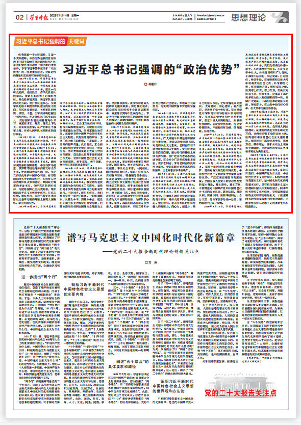 优势既是一个比较范畴,又是一个实践范畴。政治优势是我们党在政治上不同于其他任何政党的有利之处,是我们党百年来战胜一切困难的重要条件。学习习近平总书记关于“政治优势”的一系列重要论述,对新时代的理论和实践具有重要指导意义。