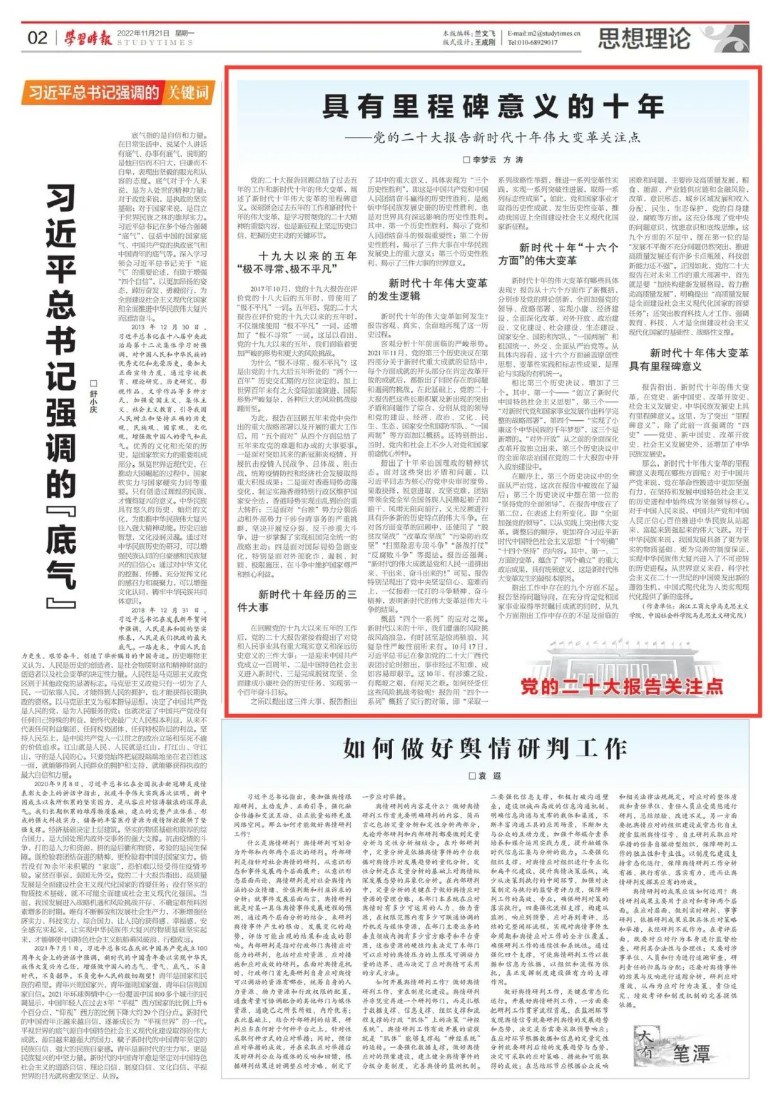 党的二十大报告回顾总结了过去五年的工作和新时代十年的伟大变革,阐述了新时代十年伟大变革的里程碑意义。深刻领会过去五年的工作和新时代十年的伟大变革,是学习贯彻党的二十大精神的重要内容,也是新征程上坚定历史自信、把握历史主动的关键环节。 十九大以来的五年“极不寻常、极不平凡” 2017年10月,党的十九大报告在评价党的十八大后的五年时,曾使用了“极不平凡”一词。五年后,党的二十大报告在评价党的十九大以来的五年时,不仅继续使用“极不平凡”一词,还增加了“极不寻常”一词。这足以看出,党的十九大以来的五年,我们面临着更加严峻的形势和更大的风险挑战。 为什么“极不寻常、极不平凡”?这是由党的十九大后五年所处的“两个一百年”历史交汇期的方位决定的,加上世界百年未有之大变局加速演进,国际形势严峻复杂,各种巨大的风险挑战接踵而至。 为此,报告在回顾五年来党中央作出的重大战略部署以及开展的重大工作后,用“五个面对”从四个方面总结了五年来攻克的难题和办成的大事要事。一是面对突如其来的新冠肺炎疫情,开展抗击疫情人民战争、总体战、阻击战,统筹疫情防控和经济社会发展取得重大积极成果;二是面对香港局势动荡变化,制定实施香港特别行政区维护国家安全法,香港局势实现由乱到治的重大转折;三是面对“台独”势力分裂活动和外部势力干涉台湾事务的严重挑衅,坚决开展反分裂、反干涉重大斗争,进一步掌握了实现祖国完全统一的战略主动;四是面对国际局势急剧变化,特别是面对外部讹诈、遏制、封锁、极限施压,在斗争中维护国家尊严和核心利益。 新时代十年经历的三件大事 在回顾党的十九大以来五年的工作后,党的二十大报告紧接着提出了对党和人民事业具有重大现实意义和深远历史意义的三件大事:一是迎来中国共产党成立一百周年,二是中国特色社会主义进入新时代,三是完成脱贫攻坚、全面建成小康社会的历史任务,实现第一个百年奋斗目标。 之所以提出这三件大事,报告指出了其中的重大意义,具体表现为“三个历史性胜利”,即这是中国共产党和中国人民团结奋斗赢得的历史性胜利,是彪炳中华民族发展史册的历史性胜利,也是对世界具有深远影响的历史性胜利。其中,第一个历史性胜利,揭示了党和人民团结奋斗的极端重要性;第二个历史性胜利,揭示了三件大事在中华民族发展史上的重大意义;第三个历史性胜利,揭示了三件大事的世界意义。 新时代十年伟大变革的发生逻辑 新时代十年的伟大变革如何发生?报告客观、真实、全面地再现了这一历史过程。 客观分析十年前面临的严峻形势。2021年11月,党的第三个历史决议在第四部分关于新时代重大成就的总结中,每个方面成就的开头部分在肯定改革开放的成就后,都指出了同时存在的问题和遇到的挑战。在此基础上,党的二十大报告把这些长期积累及新出现的突出矛盾和问题作了综合,分别从党的领导和党的建设、经济、政治、文化、民生、生态、国家安全和国防军队、“一国两制”等方面加以概括。还特别指出,当时,党内和社会上不少人对党和国家前途忧心忡忡。 指出了十年来治国理政的精神状态。面对这些突出矛盾和问题,以习近平同志为核心的党中央审时度势、果敢抉择,锐意进取、攻坚克难,团结带领全党全军全国各族人民撸起袖子加油干、风雨无阻向前行,义无反顾进行具有许多新的历史特点的伟大斗争。在对各方面变革的回顾中,还使用了“脱贫攻坚战”“改革攻坚战”“污染防治攻坚”“扫黑除恶专项斗争”“备战打仗”“反腐败斗争”等提法。报告还强调:“新时代的伟大成就是党和人民一道拼出来、干出来、奋斗出来的!”可见,报告特别呈现出了党中央坚定信心、迎难而上,一仗接着一仗打的斗争精神、奋斗精神,表明新时代的伟大变革是伟大斗争的结果。 概括“四个一系列”的应对之策。新时代以来的十年,我们遭遇的风险挑战风高浪急,有时甚至是惊涛骇浪,其复杂性严峻性前所未有。10月17日,习近平总书记在参加党的二十大广西代表团讨论时指出,事非经过不知难,成如容易却艰辛。这10年,有涉滩之险,有爬坡之艰,有闯关之难。如何经受住这些风险挑战考验呢?报告用“四个一系列”概括了实行的对策,即“采取一系列战略性举措,推进一系列变革性实践,实现一系列突破性进展,取得一系列标志性成果”。如此,党和国家事业才取得历史性成就、发生历史性变革,推动我国迈上全面建设社会主义现代化国家新征程。 新时代十年“十六个方面”的伟大变革 新时代十年的伟大变革有哪些具体表现?报告从十六个方面作了新概括,分别涉及党的理论创新、全面加强党的领导、战略部署、实现小康、经济建设、全面深化改革、对外开放、政治建设、文化建设、社会建设、生态建设、国家安全、国防和军队、“一国两制”和祖国统一、外交、全面从严治党等。从具体内容看,这十六个方面涵盖原创性思想、变革性实践和标志性成果,是理论与实践的有机统一。 相比第三个历史决议,增加了三个。其中,第一个——“创立了新时代中国特色社会主义思想”,第三个——“对新时代党和国家事业发展作出科学完整的战略部署”,第四个——“实现了小康这个中华民族的千年梦想”,这三个是新