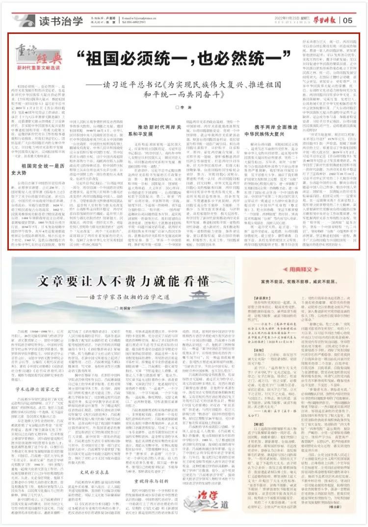 祖国必须统一,也必然统一,是两岸关系发展历程的历史定论,也是新时代中华民族伟大复兴的必然要求。《为实现民族伟大复兴、推进祖国和平统一而共同奋斗》是习近平总书记2019年1月2日在《告台湾同胞书》发表40周年纪念会上的讲话,收录在《十九大以来重要文献选编》上册。这篇重要文献全面阐述了立足新时代、在实现中华民族伟大复兴征程中推进祖国和平统一的重大政策主张,是做好新时代对台工作的根本遵循和行动指南,对我们坚定信心,团结包括广大台湾同胞在内的全体中华儿女,共同致力两岸关系和平发展、中华民族伟大复兴,完成祖国和平统一大业,具有重大指导意义。