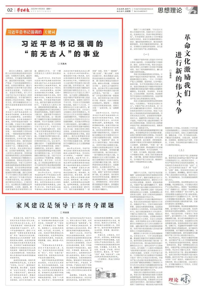 前无古人的事业,是指以前的人从来没有做过的或者从没有过的、空前的伟大创举。越是伟大的事业,往往越是充满艰难险阻,越是需要开拓创新。中国共产党是一个富有创造精神的伟大的党,在领导中国革命、建设与改革的奋斗历程中勇于进行理论探索和实践创新,干成惊天伟业,创造百年辉煌。深入学习习近平总书记关于前无古人的事业的重要论述,对于我们新时代新征程上坚定历史自信,增强历史主动,谱写全面建设社会主义现代化国家崭新篇章具有重要意义。 2012年12月31日,习近平总书记在十八届中央政治局第二次集体学习时强调,改革开放是前无古人的崭新事业,必须坚持正确的方法论,在不断实践探索中推进。 改革开放是我们党的一次伟大觉醒,正是这个伟大觉醒孕育了我们党从理论到实践的伟大创造。这是一场思想理论的深刻变革,一场改革组织方式的深刻变革,一场国家制度和治理体系的深刻变革,一场人民广泛参与的深刻变革。在中华大地上推进改革开放伟大事业,我们的老祖宗没有讲过,其他社会主义国家也没有干过,只能通过实践、认识、再实践、再认识的反复过程,从实践中获得真知。我们以人民为中心推进改革,坚持加强党的领导和尊重人民首创精神相结合,坚持顶层设计和摸着石头过河相协调,坚持试点先试和全面推进相促进,开创了以改革开放推动党和国家各项事业取得历史性成就、发生历史性变革的新局面。改革道路上仍面临着很多复杂的矛盾和问题,我们已经啃下了不少硬骨头但还有硬骨头要啃,我们攻克了不少难关但还有许多难关要攻克。迈上新征程,我们要坚定改革信心,汇聚改革合力,充分调动各方面推进改革的积极性、主动性、创造性,推动新发展阶段改革取得更大突破、展现更大作为,一步一个脚印把前无古人的伟大事业推向前进。 2014年7月9日,习近平总书记在第六轮中美战略与经济对话和第五轮中美人文交流高层磋商联合开幕式上的致辞中指出,构建中美新型大国关系是一项前无古人、后启来者的事业,没有现成经验和模式可以照搬,出现一些困难甚至波折不足为怪。有问题并不可怕,关键是我们要共同解决问题,而不能被问题牵着鼻子走。 我们处在前所未有的变革时代,干着前无古人的伟大事业,面临着难得的发展机遇,也必然会遭遇各种可以预见和难以预见的风险挑战。构建中美新型大国关系,是新形势下中国外交一次重大理论创新。这一理念体现了深邃的历史眼光和前瞻的战略思维,符合中美两国人民和世界人民的根本利益。当今世界既不安宁也不太平。中美作为大国,双方加强沟通和合作,有助于推动世界增加稳定性和确定性,有助于推动世界和平与发展。中美能否处理好彼此关系,攸关世界前途命运,是两国必须回答好的世纪之问。过去50年,国际关系中一个最重要的事件就是中美关系恢复和发展,造福了两国和世界。未来50年,国际关系中最重要的事情是中美必须找到正确的相处之道。关于中美两国的正确相处之道,习近平总书记已经给出了明确答案,那就是相互尊重、和平共处、合作共赢。这三项原则是审视中美关系半个多世纪风云跌宕得出的重要论断,也是当今时代大国之间彼此交往的正确之道。 2014年8月20日,习近平总书记在纪念邓小平同志诞辰110周年座谈会上的讲话中指出,中国特色社会主义是前无古人的伟大事业,改革开放和社会主义现代化建设还有很长的路要走。2015年2月17日,习近平总书记在春节团拜会上的讲话中强调,我们正在进行的中国特色社会主义事业,是前无古人的开创性事业,前进道路不可能一帆风顺,我们必须准备进行具有许多新的历史特点的伟大斗争。 中国特色社会主义是实现中华民族伟大复兴的必由之路。改革开放以来,我们党全部理论和实践的主题就是坚持和发展中国特色社会主义。中国特色社会主义不是从天上掉下来的,也不是别人恩赐施舍的,而是中国共产党领导中国人民进行的伟大创造,是党和人民历尽千辛万苦、付出巨大代价取得的根本成就。党的十八大以来,中国特色社会主义进入新时代。新时代十年的伟大变革,在社会主义发展史上具有里程碑意义。科学社会主义在21世纪的中国焕发出新的蓬勃生机,中国特色社会主义正成为21世纪科学社会主义发展的旗帜,成为振兴世界社会主义的中流砥柱。我们清醒认识到,新时代坚持和发展中国特色社会主义是一场艰巨而伟大的社会革命,必须准备经受风高浪急甚至惊涛骇浪的重大考验。前进道路上,我们必须增强忧患意识,坚持底线思维,依靠顽强斗争打开事业发展新天地,谱写新时代中国特色社会主义更加绚丽的华章。 2014年12月19日,习近平总书记在澳门特别行政区政府欢迎晚宴上的致辞中指出,作为前无古人的事业,“一国两制”实践不会一帆风顺。2022年7月1日,习近平总书记在庆祝香港回归祖国25周年大会暨香港特别行政区第六届政府就职典礼上的讲话中强调,“一国两制”是前无古人的伟大创举。“一国两制”是经过实践反复检验了的,符合国家、民族根本利益,符合香港、澳门根本利益,得到14亿多祖国人民鼎力支持,得到香港、澳门居民一致拥护,也得到国际社会普遍赞同。这样的好制度,没有任何理由改变,必须长期坚持! 新时代十年,我们全面准确推进“一国两制”实践,坚持“一国两制”、“港人治港”、“澳人