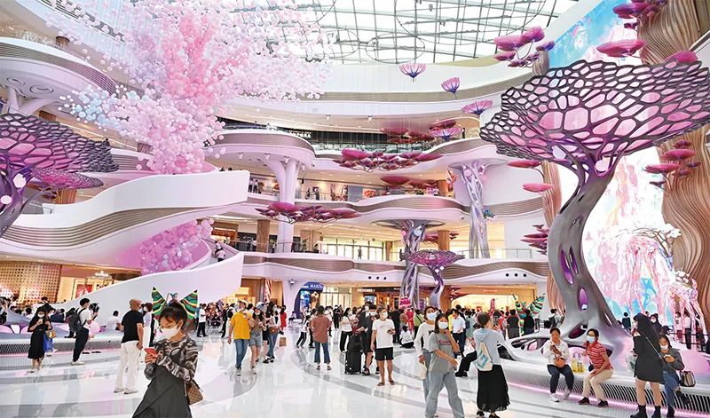 中国坚持对外开放的基本国策,不断以中国新发展为世界提供新机遇。图为2022年10月28日,全球最大单体免税店——海口国际免税城正式开业,市民游客在免税城购物游乐。人民图片 张俊其/摄