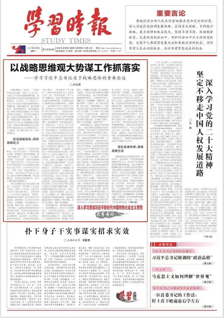 “战略”是党的二十大报告的高频词。习近平总书记在二十届中央政治局第一次集体学习时再次强调,要“坚定战略自信”。党的二十大主题中表述的“自信自强”,报告开篇强调的“坚定历史自信”,贯穿习近平新时代中国特色社会主义思想的世界观和方法论中的“必须坚持自信自立”,这些“自信”都是战略意义上的自信。面对世界百年未有之大变局,我们必须保持战略清醒,坚定战略自信。没有强大的战略自信,就不可能有坚定的战略定力。