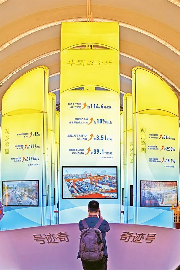 2022年10月8日,观众在“奋进新时代”主题成就展中央综合展区内拍摄中国经济“奇迹号”巨轮模型。 新华社记者 李鑫/摄