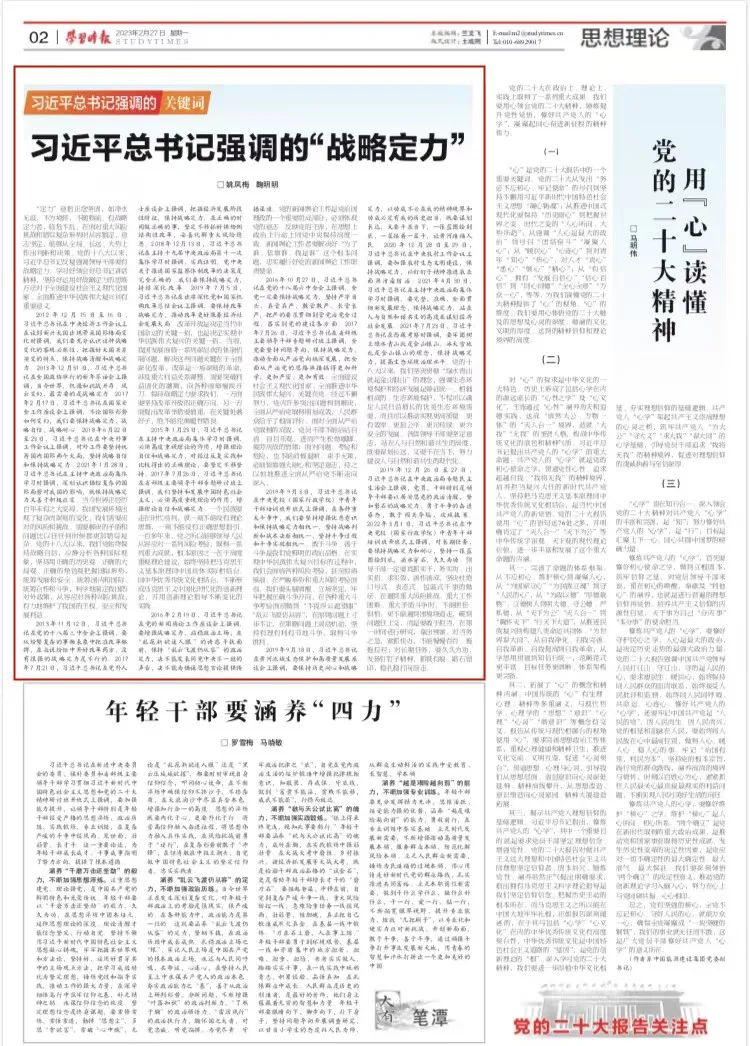 2019年12月26日至27日,习近平总书记在中央政治局专题民主生活会上强调,党员、干部特别是领导干部要以居安思危的政治清醒、坚如磐石的战略定力、勇于斗争的奋进姿态,敢于闯关夺隘、攻城拔寨。2022年3月1日,习近平总书记在中央党校(国家行政学院)中青年干部培训班开班式上强调,对长期任务,要保持战略定力和耐心,坚持一张蓝图绘到底,滴水穿石,久久为功。领导干部一定要真抓实干,务实功、出实招、求实效,善作善成,坚决杜绝口号式、表态式、包装式干事的做法。在遇到重大风险挑战、重大工作困难、重大矛盾斗争时,不能胆怯、惧怕,更不能遇到困境绕道走,碰到问题往上交,而是要敢于担当,在第一时间进行研究,拿出预案。对当务之急,紧抓快办,不能慢慢吞吞、拖拖拉拉;对长期任务,要久久为功,发扬钉钉子精神,抓铁有痕、踏石留印,稳扎稳打向前走。