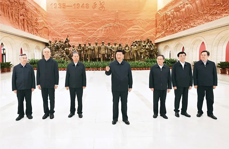 2022年10月27日,中共中央总书记、国家主席、中央军委主席习近平带领中共中央政治局常委李强、赵乐际、王沪宁、蔡奇、丁薛祥、李希,瞻仰延安革命纪念地。这是习近平在延安革命纪念馆参观《伟大历程——中共中央在延安十三年历史陈列》结束时发表重要讲话。 新华社记者 燕雁/摄