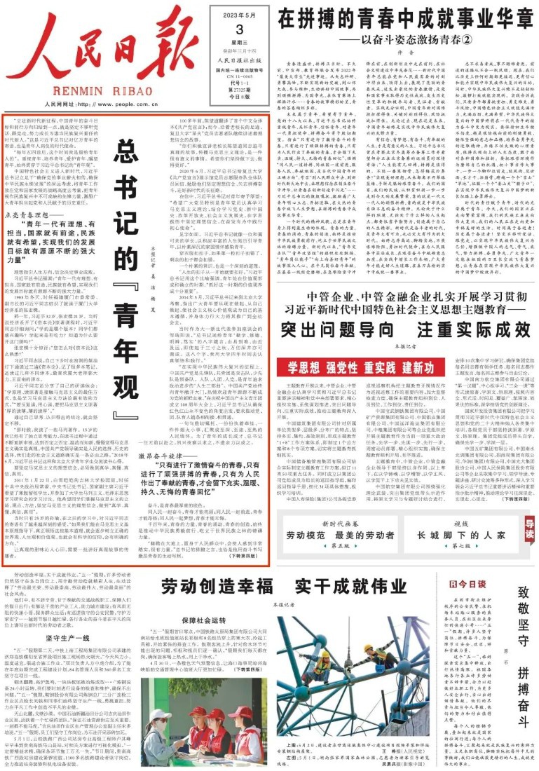 总书记的“青年观” “立足新时代新征程,中国青年的奋斗目标和前行方向归结到一点,就是坚定不移听党话、跟党走,努力成长为堪当民族复兴重任的时代新人。”这是习近平总书记对亿万青年的寄语,也是青年人肩负的时代使命。 “每年五四前后,这个时间我是留给青年人的”。重视青年、培养青年、爱护青年、瞩望青年,始终贯穿于习近平总书记的“青年观”。 中国特色社会主义进入新时代,习近平总书记立足于“确保党的事业薪火相传,确保中华民族永续发展”的深远考虑,将青年工作放在党和国家发展的战略高度去考量,把青年视作民族复兴中不可或缺的先锋力量,激励广大青年担当起党和人民赋予的历史重任。 点亮青春理想—— “青年一代有理想、有担当,国家就有前途,民族就有希望,实现我们的发展目标就有源源不断的强大力量” 理想指引人生方向,信念决定事业成败。 习近平总书记强调:“青年一代有理想、有担当,国家就有前途,民族就有希望,实现我们的发展目标就有源源不断的强大力量。” 1985年冬天,时任福建厦门市委常委、副市长的习近平同志结识了就读于厦门大学经济系的张宏樑。 那一年,习近平32岁,张宏樑21岁。当听说经济系开了《资本论》原著课程时,习近平同志仔细询问:“学的是哪个版本?同学们都感兴趣吗?学起来是否吃力?知道为什么要开这门课吗?” 张宏樑十分惊讶:“您怎么对《资本论》这么熟悉?” 习近平同志说,自己下乡时在窑洞的煤油灯下通读过三遍《资本论》,记了很多本笔记,还读过几种不同译本,最喜欢厦大老师郭大力、王亚南的译本。 习近平同志还分享了自己的研读体会:“学原理、读原著是接触马克思主义的最佳方式,也是学习马克思主义方法论最有效的方式。”“要反复读,用心读,要把马克思主义原著‘厚的读薄,薄的读厚’。” 通过自己思考、认识得出的结论,就会坚定不移。 “那时候,我读了一些马列著作。15岁的我已经有了独立思考能力,在读书过程中通过不断重新审视,达到否定之否定、温故而知新,慢慢觉得马克思主义确实是真理,中国共产党领导确实是人民的选择、历史的选择,我们走的社会主义道路确实是一条必由之路。”2018年5月,习近平总书记这样和北京大学青年学生交流读书心得。 要坚定马克思主义的理想信念,必须做到真学、真懂、真信、真用。 2011年1月22日,白雪皑皑的吉林大学校园里,时任中共中央政治局常委、中央书记处书记、国家副主席习近平看望了寒假留校学生,并参加了大学生马列主义、毛泽东思想学习研究会的学习讨论。他希望同学们掌握马克思主义的立场、观点、方法,坚定马克思主义的理想信念,做到“真学、真懂、真信、真用”。 当时只有25岁的孙瑜,在之后的学习中,对习近平同志的寄语有了越来越深刻的感受,“如果我们能在马克思主义基本原理指导下,真正领悟这些基本道理,就会逐步树立正确的世界观、人生观和价值观,也就会有科学的信仰,会有明确的方向。” 让真理的甜味沁入心田,需要一批讲好真理故事的传播者。 100多年前,陈望道翻译了首个中文全译本《共产党宣言》;而今,沿着老校长的足迹,复旦大学“星火”党员志愿者队继续讲述着理想信念的故事。 “你们积极宣讲老校长陈望道同志追寻真理的故事,传播马克思主义理论,是一件很有意义的事情。希望你们坚持做下去、做得更好。” 2020年6月,习近平总书记给复旦大学《共产党宣言》展示馆党员志愿服务队全体队员回信,勉励他们坚定理想信念、矢志拼搏奋斗,走好新时代的长征路。 在信中,习近平总书记对青年寄予厚望:“希望广大党员特别是青年党员认真学习马克思主义理论,结合学习党史、新中国史、改革开放史、社会主义发展史,在学思践悟中坚定理想信念,在奋发有为中践行初心使命”。 见字如面。习近平总书记就像一位和蔼可亲的学长,以积淀丰富的人生阅历引导青年,以朴素深沉的家国情怀感染青年。 穿衣服扣扣子,如果第一粒扣子扣错了,剩余的扣子都会扣错。 一个朴素的常识,也是一个深刻的道理。 “人生的扣子从一开始就要扣好。”习近平总书记用这个比喻强调,青年处在价值观形成和确立的时期,“抓好这一时期的价值观养成十分重要”。 2014年5月,习近平总书记来到北京大学考察,指出广大青年要从现在做起、从自己做起,使社会主义核心价值观成为自己的基本遵循,并身体力行大力将其推广到全社会去。 当时作为大一新生代表参加座谈会的邹瑞阳说,“总书记送给青年‘勤学、修德、明辨、笃实’的八字箴言,由易到难、由近及远,即使起于三寸之坎,万仞深井亦可凿成。这八个字,我用大学四年时间去认真领悟和践行。” “在实现中华民族伟大复兴的征程上,中国共产党是先锋队,共青团是突击队,少先队是预备队。入队、入团、入党,是青年追求政治进步的‘人生三部曲’。中国共产党始终向青年敞开大门,热情欢迎青年源源不断成为党的新鲜血液。”在庆祝中国共产主义青年团成立100周年大会上,习近平总书记从确保红色江山永不变色的角度出发,要求推动党、团、队育人链条相衔接、相贯通。 一句句殷切嘱托、一份份执着牵挂、一件件烟火小事,汇聚成至深、至浓、至热的人民情怀。为了青年的成长成才,总书记一往无前以赴之,夙兴夜寐以求之,不