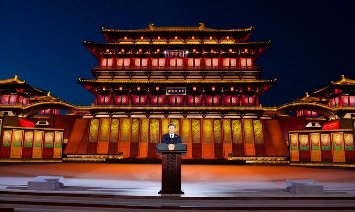 5月18日晚,国家主席习近平和夫人彭丽媛在陕西省西安市大唐芙蓉园为出席中国-中亚峰会的中亚国家元首夫妇举行欢迎仪式和欢迎宴会。宴会后,习近平夫妇同贵宾们共同观看中国同中亚国家人民文化艺术年暨中国-中亚青年艺术节开幕式演出。这是习近平和彭丽媛同贵宾们共同前往元功门举行欢迎宴会。新华社记者 黄敬文 摄宴会后,习近平夫妇同贵宾们共同观看中国同中亚国家人民文化艺术年暨中国-中亚青年艺术节开幕式演出。