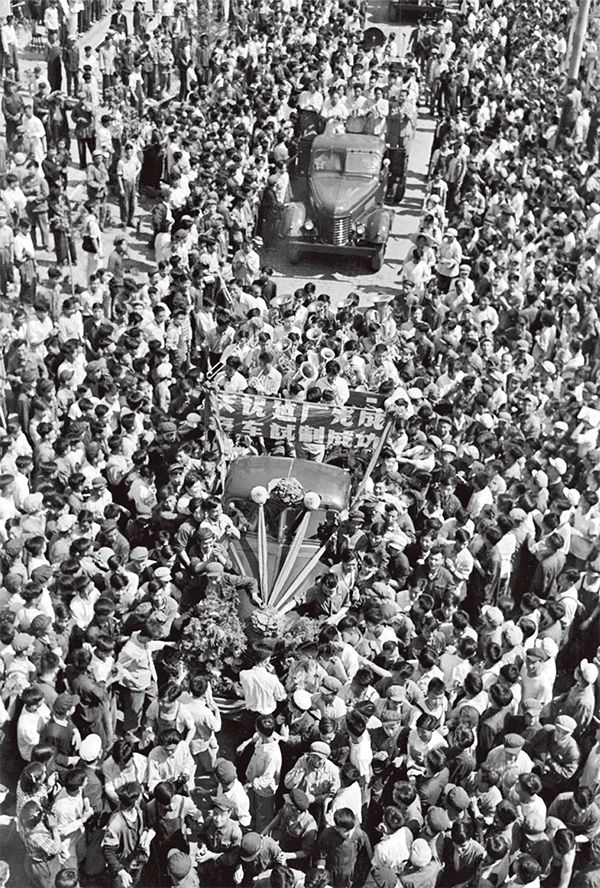 1956年7月15日,长春第一汽车制造厂生产出中国第一辆解放牌汽车,从此结束了中国不能生产汽车的历史。图为第一批国产解放牌载重汽车排成长列开出长春第一汽车制造厂的时候,全厂职工夹道欢呼。 新华社发