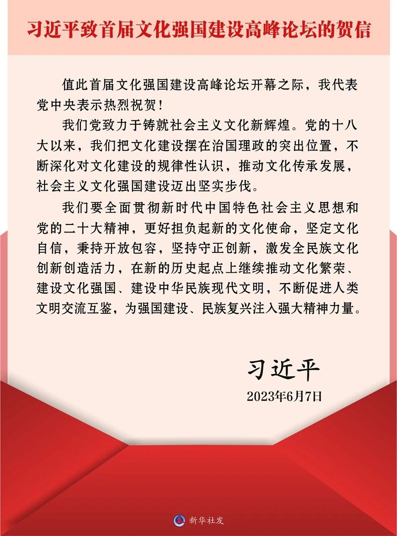 首届文化强国建设高峰论坛7日下午在深圳开幕。中共中央总书记、国家主席、中央军委主席习近平发来贺信,代表党中央表示热烈祝贺。习近平在贺信中指出,我们党致力于铸就社会主义文化新辉煌。党的十八大以来,我们把文化建设摆在治国理政的突出位置,不断深化对文化建设的规律性认识,推动文化传承发展,社会主义文化强国建设迈出坚实步伐。习近平强调,我们要全面贯彻新时代中国特色社会主义思想和党的二十大精神,更好担负起新的文化使命,坚定文化自信,秉持开放包容,坚持守正创新,激发全民族文化创新创造活力,在新的历史起点上继续推动文化繁荣、建设文化强国、建设中华民族现代文明,不断促进人类文明交流互鉴,为强国建设、民族复兴注入强大精神力量。