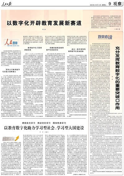 教育兴则国家兴,教育强则国家强。加快建设教育强国,推进教育数字化是重要内容。党的二十大报告提出:“推进教育数字化,建设全民终身学习的学习型社会、学习型大国。”习近平总书记指出:“教育数字化是我国开辟教育发展新赛道和塑造教育发展新优势的重要突破口。”新时代新征程,我们要牢牢把握新一轮科技革命和产业变革深入发展的机遇,深刻认识教育数字化的重要意义,深入研究教育数字化的方法路径,助力教育大国向教育强国跨越,为学习型社会、学习型大国建设提供有力支撑。本期观察版围绕这一主题进行阐述。
