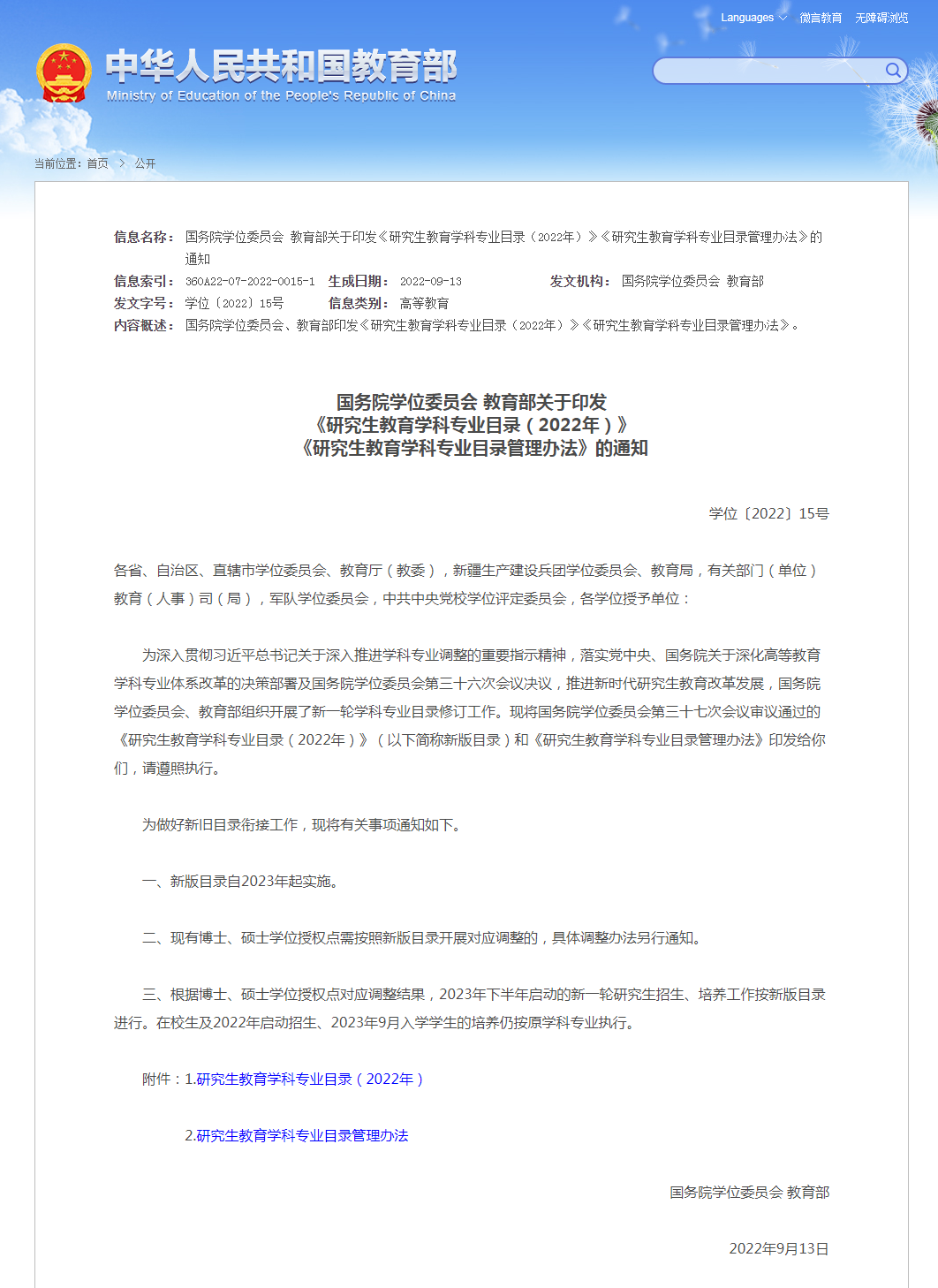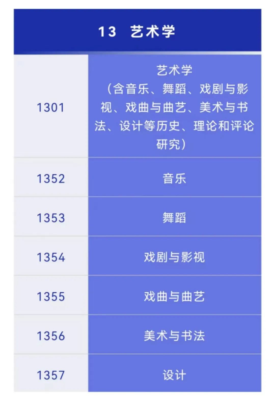 近日,国务院学位委员会、教育部印发通知,发布《研究生教育学科专业目录(2022年)》(以下简称新版目录)和《研究生教育学科专业目录管理办法》。新版目录自2023年起实施。其中近日,国务院学位委员会、教育部印发通知,发布《研究生教育学科专业目录(2022年)》(以下简称新版目录)和《研究生教育学科专业目录管理办法》。新版目录自2023年起实施。其中,对“艺术学”有如下调整:,对“艺术学”有如下调整: