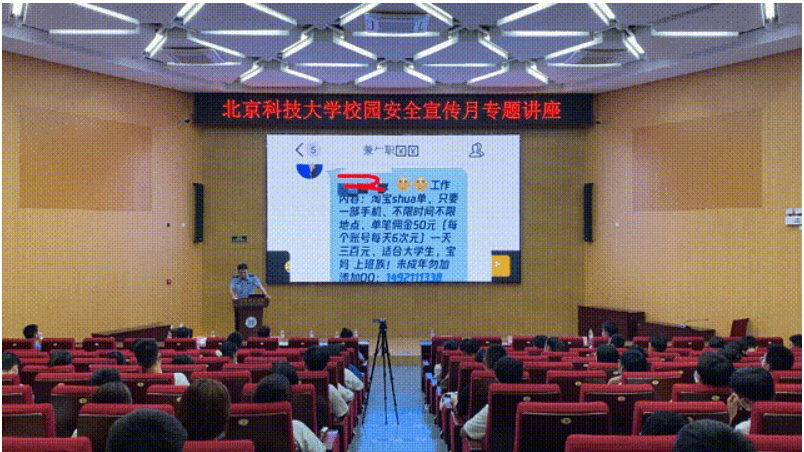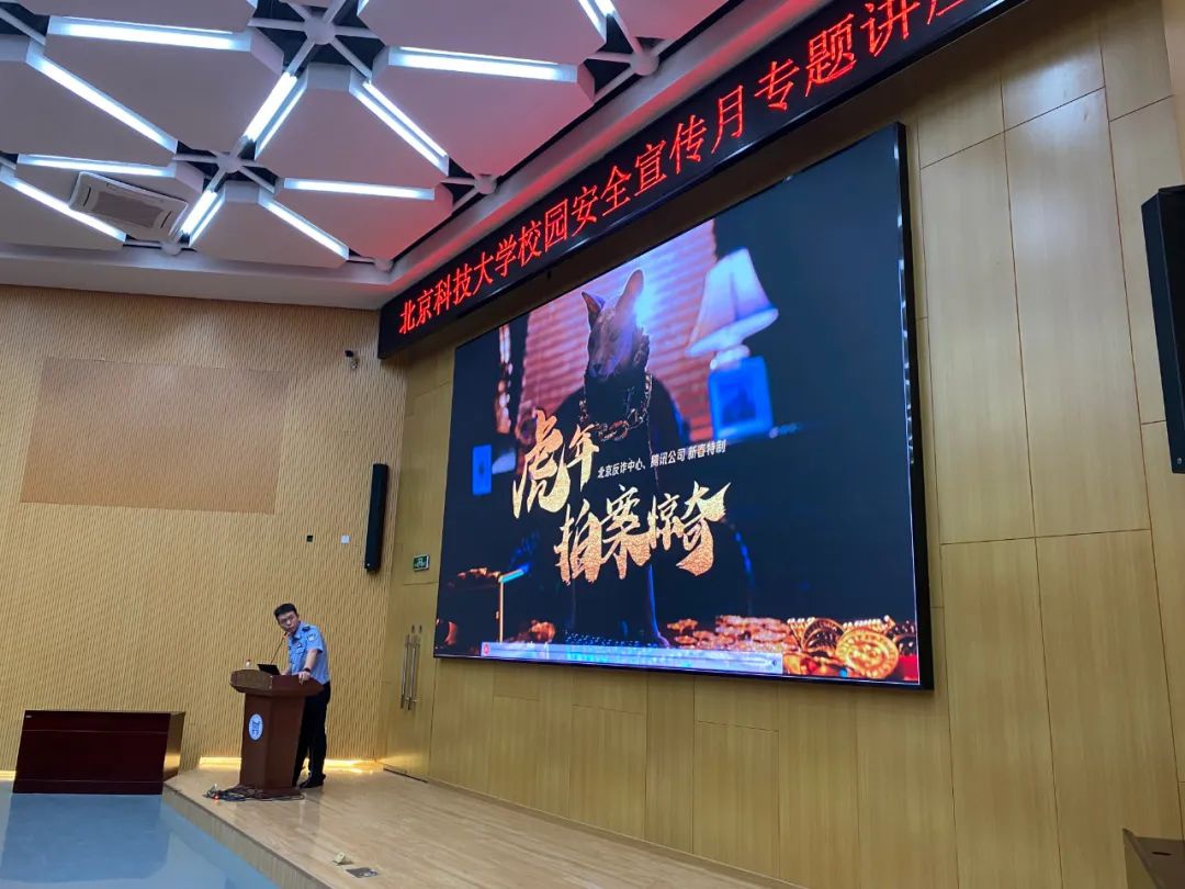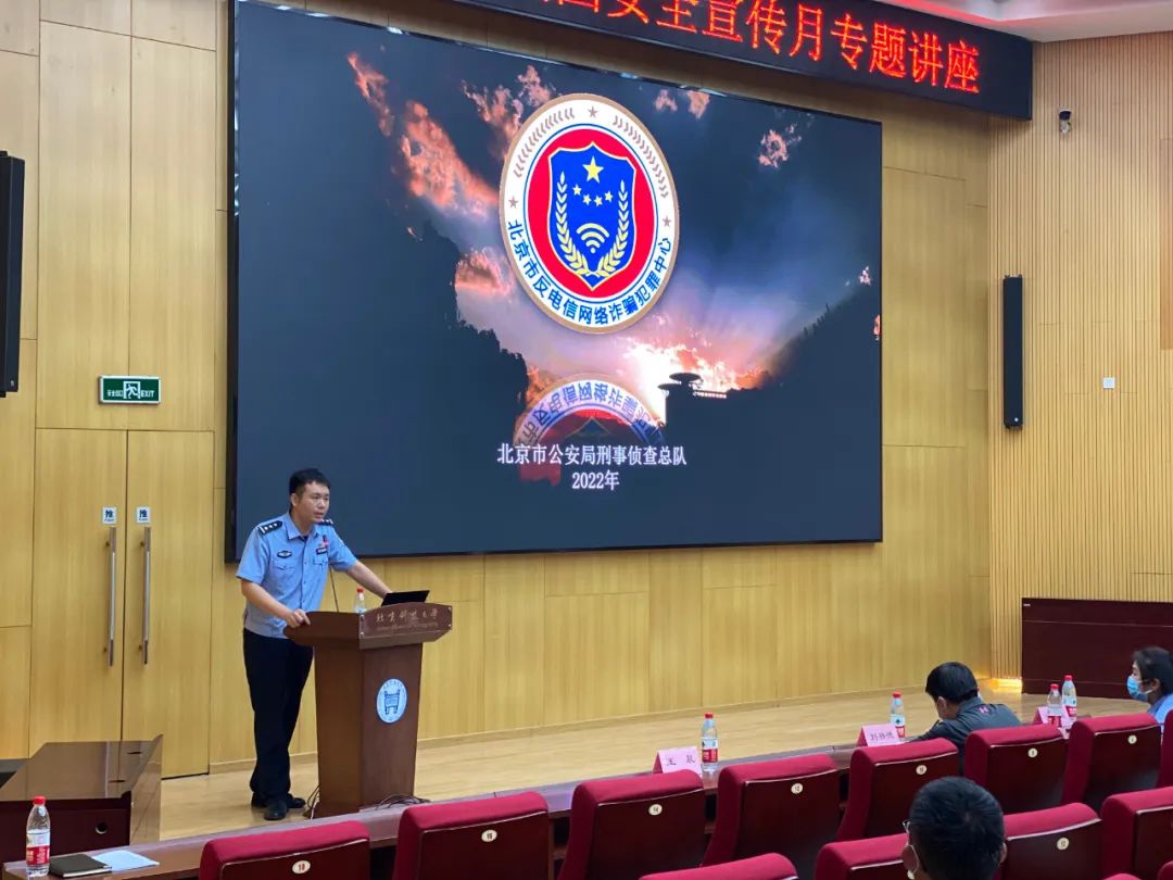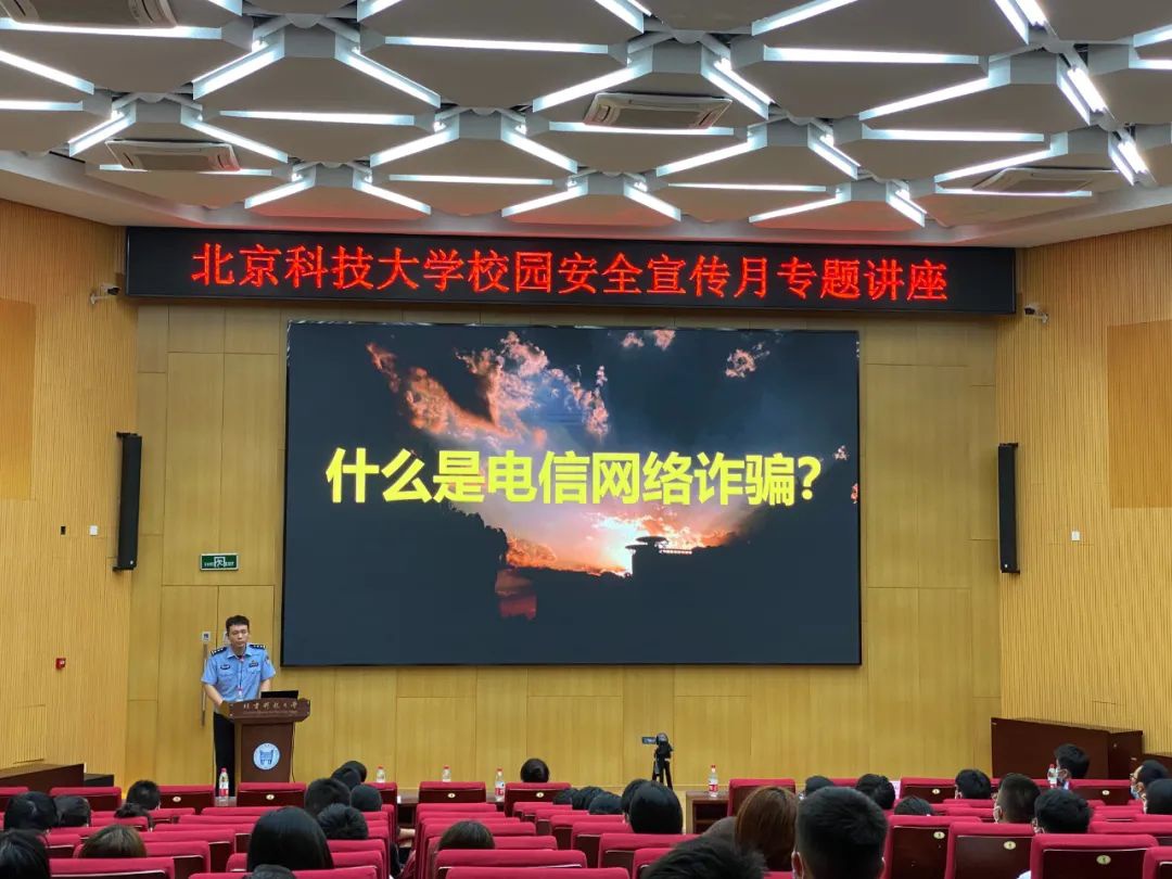 房山区刑侦支队反诈中心杨洲警官用真实案例为同学们讲解常见的诈骗手段,特别是网络诈骗的类型与特点、反电信网络诈骗的预防和措施等内容,传授防骗小知识,以生动而有趣的语言让同学们意识到校园生活中存在的各类骗局,告诫同学们保持冷静、仔细观察、提高防范意识。