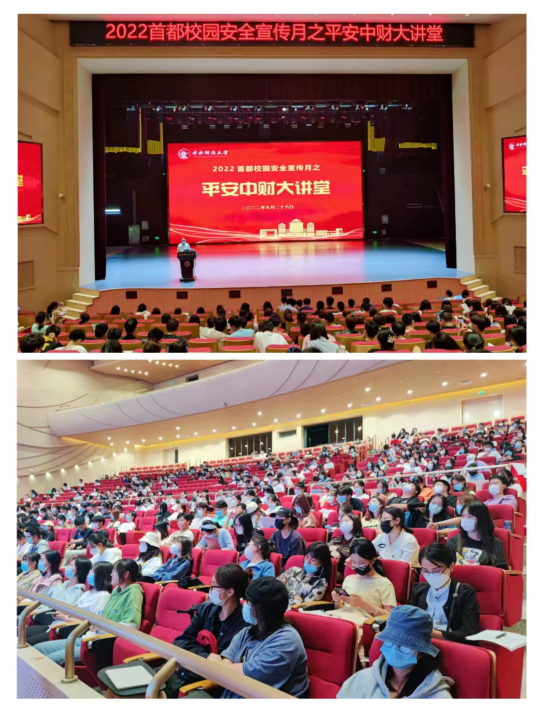 “2022年首都校园安全宣传月之平安中财大讲堂”于9月28日正式举办。内容包括交通安全、防电信网络诈骗和消防安全三个专题,分别由北京市海淀区高等院校交通安全联席会办公室主任李希宝警官、北京市公安局刑侦总队反诈中心高山警官和北京市昌平区消防救援支队沙河消防救援队徐晓杰分队长三位警官主讲。