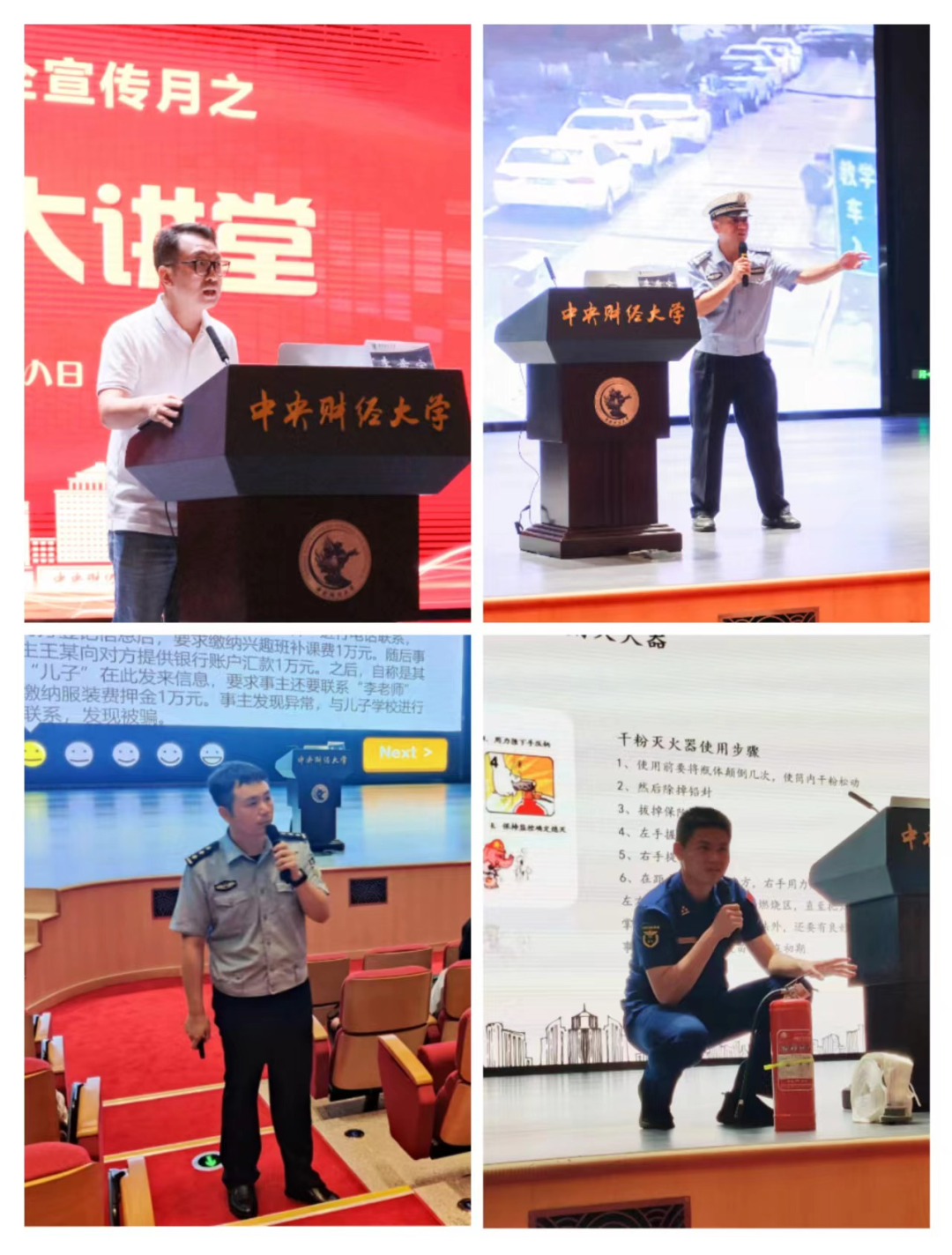 李希宝警官以各大高校交通事故现场为例,以图像分析的方式进行大学生交通安全教育。讲述一起起发生在大学校园里、大学生身边的典型交通事故案例。高山警官以现场互动问答和趣味视频答题的方式就电信网络诈骗定义和常见诈骗类型进行讲解,并详细分析了“杀猪盘”类的诈骗方式。徐晓杰分队长围绕灭火器的使用、认识消防标识、如何预防火灾、火灾如何逃生四个方面进行消防知识的讲解。
