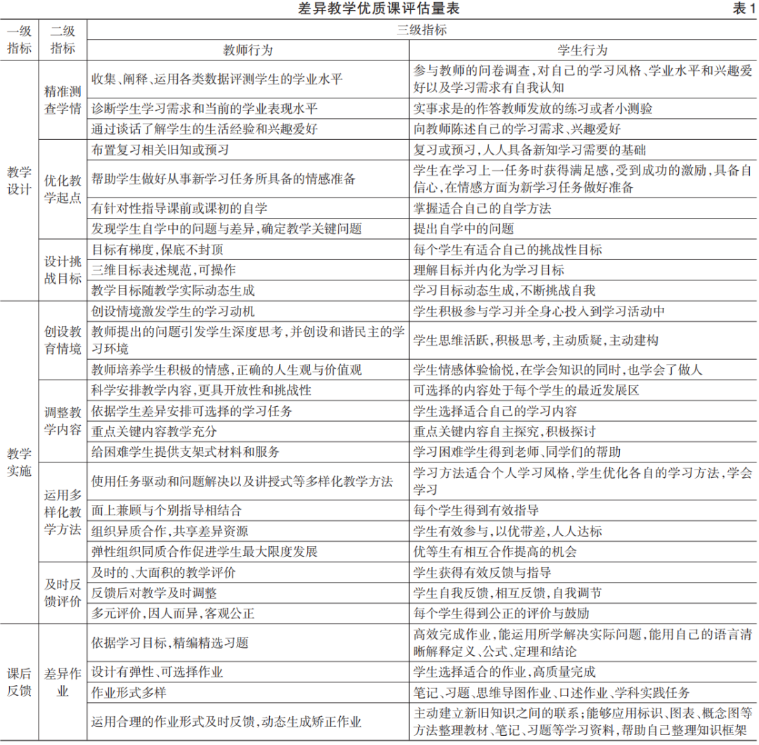 2019 年 6 月 23 日发布的《中共中央国务院关于深化教育教学改革全面提高义务教育质量的意见》中提出“强化课堂主阵地作用,精准分析学情,重视差异化教学和个别化指导,切实提高课堂教学质量”,差异教学成为发挥课堂主阵地、实现高质量教学的重要教学方式,高质量教学离不开科学、合理的课堂评价。优化课堂教学评价,是“推进教育评价关键领域改革取得实质性突破”的“关键一役”。2022 年 4 月,我国发布的义务教育各学科课程标准强调了过程性评价、增值性评价和综合性评价,关键在于学生的学习态度、参与程度和核心素养的水平,通过广泛收集课堂关键表现、典型作业和阶段性测试对学生进行综合评价。新阶段新课改,需要新的评价体系与原则进行导航,差异教学课堂观察评价体系的构建,既是对教育评价关键领域取得突破的必要尝试,也是对《深化新时代教育评价改革总体方案》(以下简称《方案》) 中“改进结果评价,强化过程评价,探索增值评价,健全综合评价”四种评价方式的积极探索。