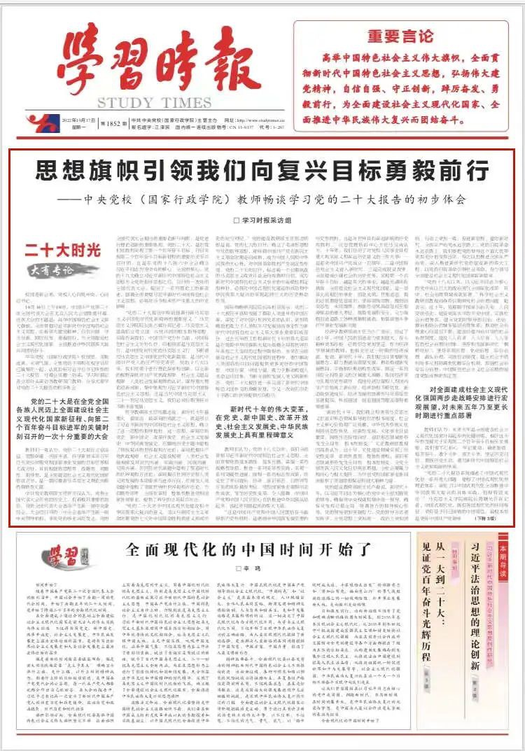 中央党校(国家行政学院)校园里,金秋送爽,天清气朗,全体党员干部和在校学员早已聚集在一起,认真聆听习近平总书记所作的二十大报告。开幕会直播一结束,学习时报记者立即分头采访各教研部门教师,分享大家学习党的二十大报告的初步体会。