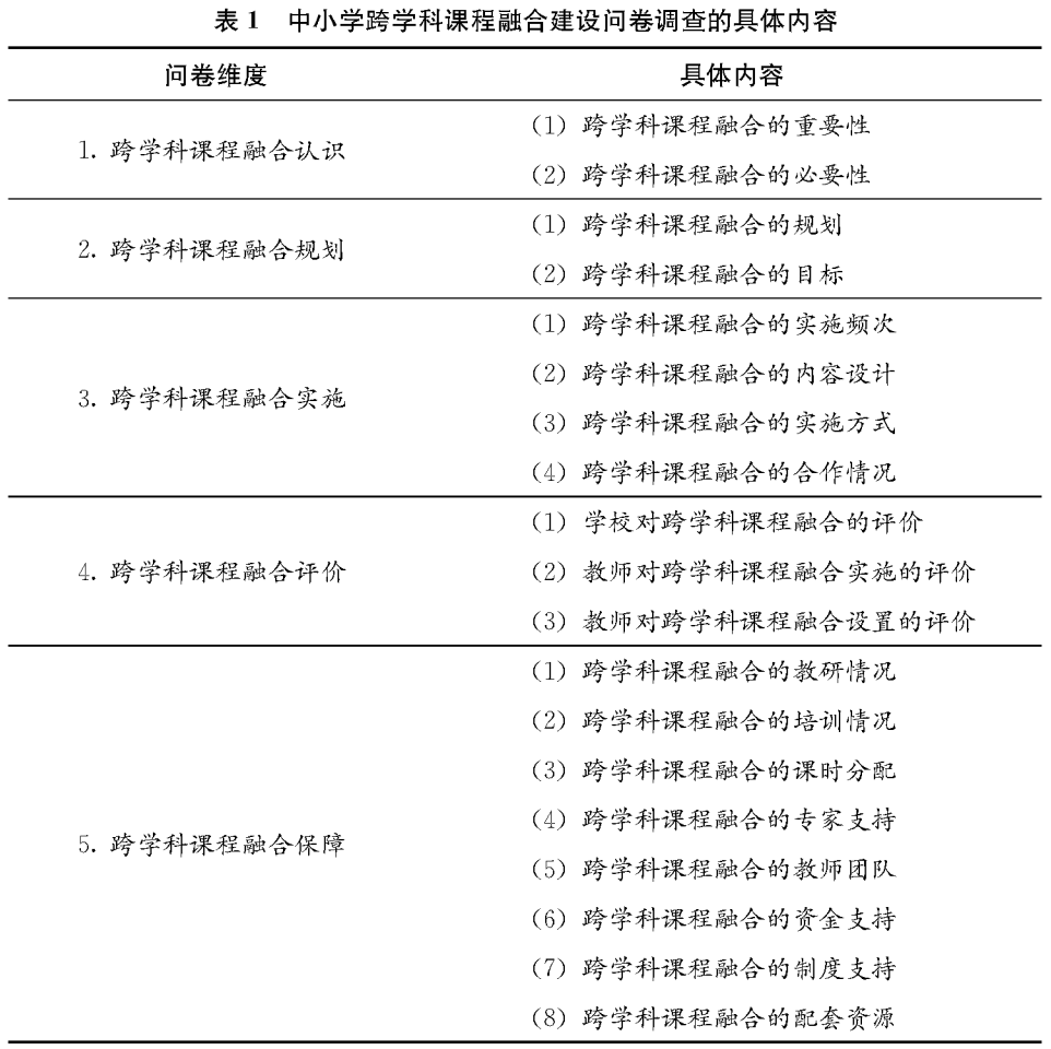 开展跨学科课程融合的现状调研,首先需要确立跨学科课程融合的设计框架。学校在开齐开足国家和地方规定课程的基础上,围绕办学理念、目标,有目的、有计划地进行跨学科的课程规划、实施与评价活动,进而将多学科的思想方法、内容知识、活动经验等进行整合。针对学校课程的实践现状分析,不同学者从不同维度形成了基本理论分析框架。其中,杨中枢提出的“ 学校课程管理三维结构” 涵盖了课程管理的主体、客体、过程等内容,依据学校课程构成划分,学校课程分为针对国家课程、地方课程以及校本课程;依据学校课程管理过程划分,学校课程分为针对课程生成系统、实施系统以及评价系统的管理;依据学校课程的层次划分,分为针对教师个人层面、小组层面以及学校层面的课程,三个维度之间相互联系、相互交错,从而构成整个学校课程管理和推进的三维结构,对于跨学科课程融合的研究具有较 高参考价值 。本研究在此基础上,结合跨学科课程融合的基本特点对该结构进行修改,建构“跨学科课程融合的设计框架”。跨学科课程融合的生成系统、实施系统与评价系统都很容易受到主客观因素的影响。因此,学校跨学科课程融合设计不仅要从主观层面强化课程融合的理念,还要从客观层面完善课程融合的物质条件保障。基于此,本研究将学校跨学科课程融合过程确定为“认识”“规划”“实施”“评价”“保障” 五个阶段,将学校跨学科课程融合层次确定为个人、学校两个层面,将学校跨学科课程融合确定为小学、初中、高中三个学段。其中, “认识 ”表示对于跨学科课程融合的认同情况 , “ 规划” 表示对跨学科课程融合的设计情况, “ 实施 ”表示对跨学科课程融合的实践情况, “评价”表示对跨学科课程融合的效果情况, “保障” 则表示对跨学科课程融合所需的各种条件 。 本研究的问卷有两部分组成。第一部分是研究对象的基本信息。具体来说, 包括研究对象的性别、学段、学科、学校区位等。第二部分是跨学科课程融合的具体内容。基于设计框架 ,本研究确定了对跨学科课程融合的认识、规划、 实施、评价和保障五个基本调查维度,通过初拟问卷 、预测问卷 、正式问卷三个环节确定调查问卷基本内容(见表1)。