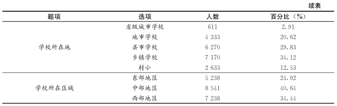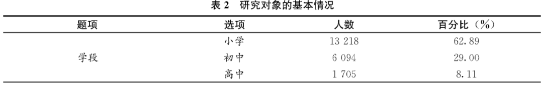 本研究通过随机抽样的方式,针对中小学教师展开问卷调查 ,关注教师对跨学科课程融合的认识,了解学校跨学科课程融合的实践 ,把握我国中小学跨学科课程融合的现状。本研究选取中小学教师为研究对象 ,共发放问卷21017份 。调查对象的具体情况 , 如表2所示 。