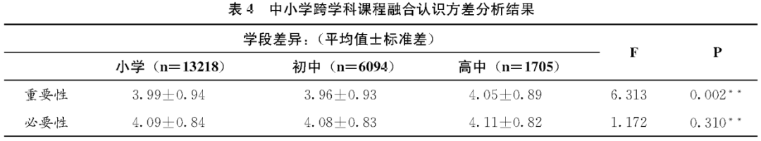 第一,中小学跨学科融合整体水平在中等偏上,教师对跨学科课程融合认同度高,但中小学跨学科课程融合实践有待改进。如表3所示,中小学跨学科课程融合水平平均值介于3.5~4.0,表明中小学跨学科课程融合整体处于中等偏上水平。但相对而言,学校跨学科课程融合规划、实施、评价和保障的均值均低于教师对跨科学课程融合认识的均值,这说明学校跨学科课程融合实践有待改进。跨学科课程融合的认识水平与保障水平差距显著,尤其是保障的平均值相对较低,说明学校层面对于跨学科课程融合的保障力度不够。