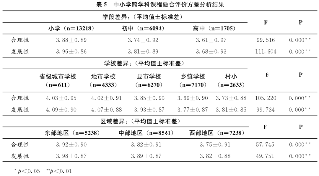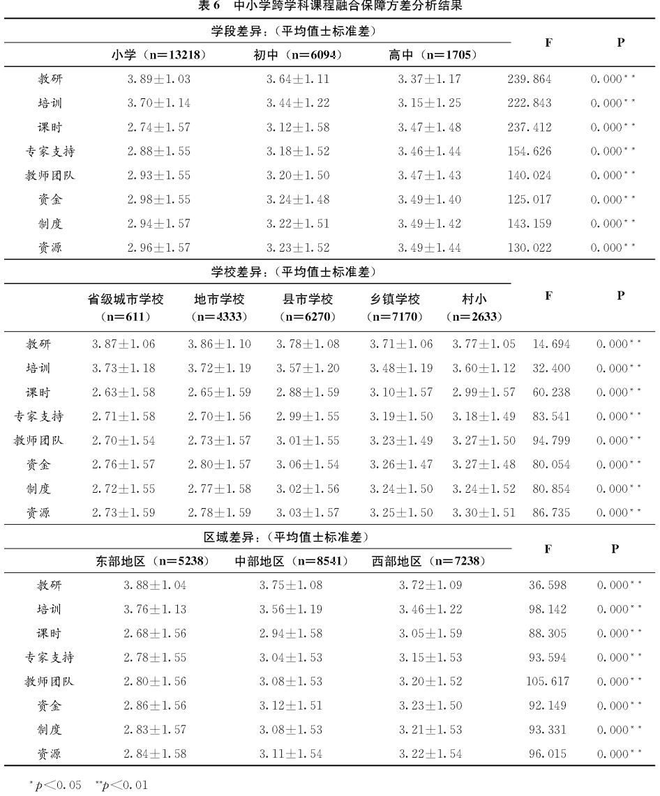 其次 , 小学最关注跨学科课程融合的教研与培训 , 高中最重视跨学科课程融合的课时保障 、 专家支持 、 教师团队建设 、资金 、制度和资源保障 。从学段上看 ,小学 、初中和高中学校在跨学科课程融合实施的支持与保障方面存在显著性差异 。如表 6所示 , 相对而言 ,在跨学科课程融合相关教研与培训方面 ,小学作的最好 , 初中次之 , 高中作的最弱 。但在跨学科课程融合的课时保障 、专家支持 、 教师团队建设 、 资金 、制度和资源保障方面 , 高中最好 , 其次为初中 , 小学最弱 。 再次,省级城市学校最关注跨学科课程融合的教研与培训,村小和乡镇学校最重视跨学科课程融合的课时保障、专家支持、教师团队建设、资金、制度和资源保障。从学校所在地来看,如上页表6所示,在跨学科课程融合相关教研与培训方面,学校给予支持力度从强到弱分别为省级城市学校、地市学校、县市学校、乡镇学校和村小;在课时、专家支持、教师团队、资金、制度和资源保障方面,学校给予支持力度从强到弱分别为村小、乡镇学校、县市学校、地市学校和省级城市学校。最后,东部地区学校最关注跨学科课程融合的教研与培训,西部地区学校最重视跨学科课程融合的课时保障、专家支持、教师团队建设、资金、制度和资源保障。从学校所在区域来看,如表6所示,在跨学科课程融合相关教研与培训方面,学校给予支持力度从强到弱分别为东部、中部、西部学校;在课时、专家支持、教师团队、资金、制度和资源保障方面,学校给予支持力度从强到弱分别为西部、中部、东部学校。总体来说,我国跨学科课程融合开展情况总体向好,但仍面临着不充分、不平衡的问题,具体表现为:跨学科课程融合的施不充分、评价不统一、保障不完善,以及跨学科课程融合在学段之间、学校之间、区域之间发展不平衡,具体表现为三点。第一,虽然中小学教师已经认识到跨学科课程融合的必要性和重要性,但相应课程实践需要加强,学校尤其需要加强对跨学科课程融合的规划设计、实施推进、多元评价和支持保障。思想是行动的先导,只有认识到位,落实工作部署才能自觉和有力。这说明自2001年新课程改革以来,学校和教师“融合”的意识越来越强,虽然中小学校都在持续推进跨学科课程“融合”的实践,但是与“认识”仍不匹配,亟待加强和提高。第二,小学学段对跨学科课程融合的推进最为重视,其次是初中,最后是高中。这一方面与学校课程的总体设计安排密切相关。随着学生的成长、学习年限的增加,学科的划分越来越细,学科界限越来越清晰。学段越低,融合的可能性和可行性越高,反之,学段越高,“融合”的实践越来越难。另一方面与考试评价制度相关。相对小学而言,初中和高中直接面临中高考,学校应对考试评价压力增加,更多关注学科课程尤其是应考科目的课程实施,对跨学科课程融合的关注相对要弱。第三,不同地区学校在跨学科课程融合实践中存在的差异与我国整体教育乃至社会经济发展水平密切相关。越是经济繁荣的区域,教育的整体发展水平越高,学校就越重视跨学科课程融合的规划、实施和评价,以及教研和培训。实际上,学校要推动跨学科课程融合实践,需要外部资源支持更需要学校对课程“融合”的意识与教师对课程进行“融合”的能力等。