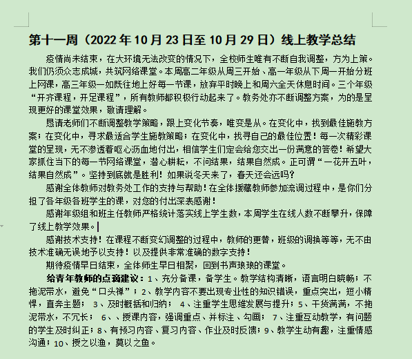 线上教学实施以来,我校一直贯彻课前有准备、课中有检查、课后有总结的工作理念。学校各级领导持续对线上课堂进行督导巡查,通过对教师在线课程的不断观摩与交流,每周对我校线上教学存在的问题和优秀做法进行总结和推广,为后期教学工作提供了详实的经验。老师们不断调整教学策略,跟上变化节奏,唯变是从。在变化中,找到最佳施教方案;在变化中,寻求最适合学生施教策略。