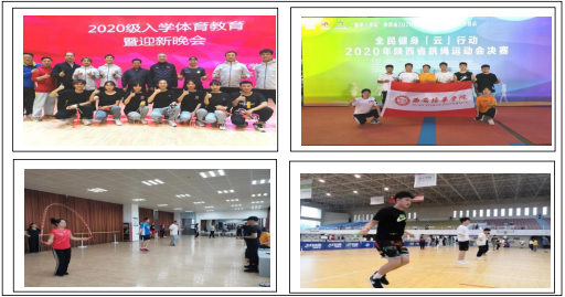 花样跳绳是一项新兴的体育运动,广泛适用于各类学校体育及民间体育群体,花样跳绳运动简单易学且易于开展。通过此项运动,可以有效地锻炼学生的心肺功能,发展学生的协调能力,以达到增强体质,提高身体素质、顽强意志品质,促进德、智、体、美全面发展的目的。2019 年,西安培华学院体育学院将花样跳绳定为所有运动项目的必备热身技能,并引进全国跳绳冠军、国家级跳绳裁判员、全国金牌级教练王阿朝老师,利用每周三、周五的业务学习时间,对全体体育教师进行培训,并在体育课堂上作为基础热身项目面向全校推广花样跳绳。2020 年成立花样跳绳俱乐部,并正式将花样跳绳运动纳入到公共体育课程之一,俱乐部的诞生以及花样跳绳课程体系的建设,极大地推动了该项目在学校的推广和发展,也为学校产教融合输送了一大批专业性人才。