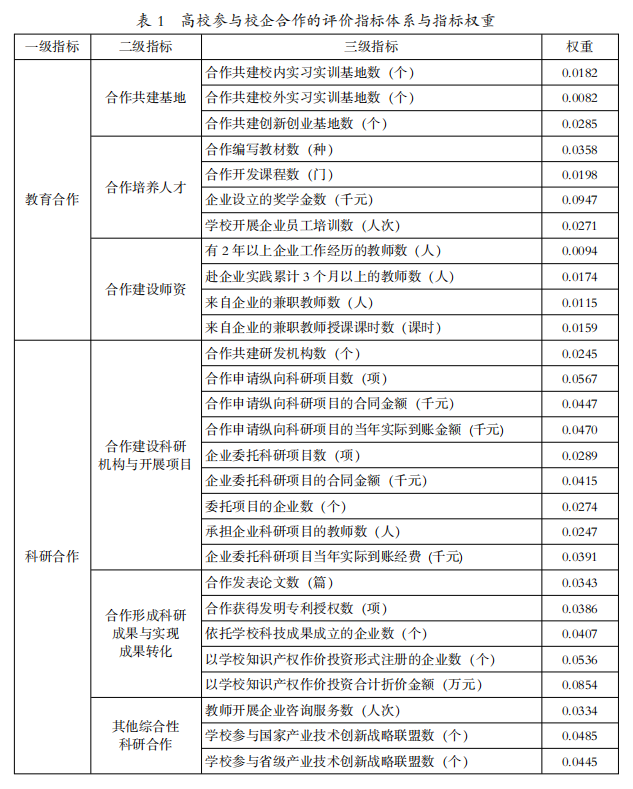 通过熵权法赋权后得到的高校参与校企合作各指标权重(见表1)。