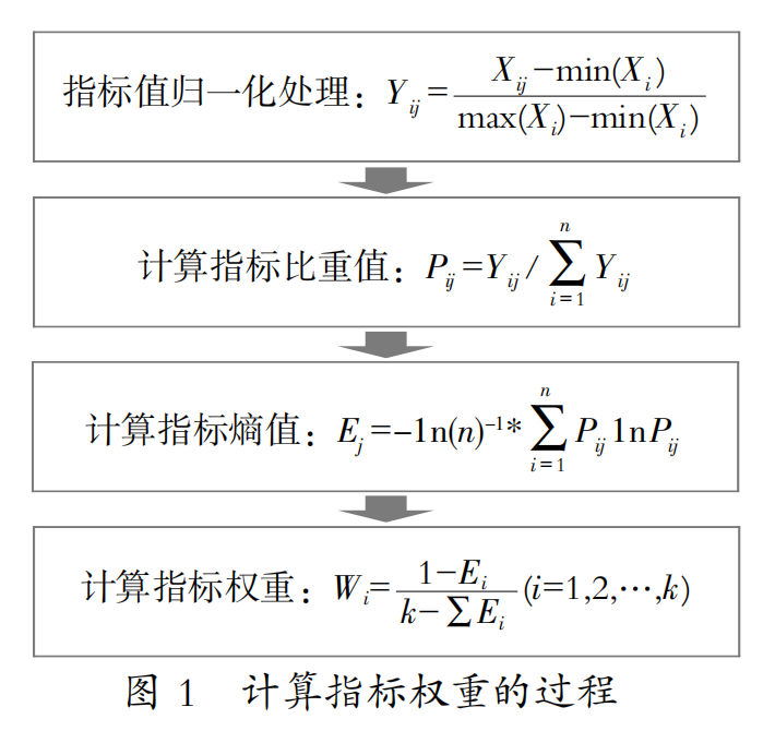 本研究的指标赋权采用熵权法。熵权法是一种客观赋值方法。在具体使用的过程中,熵权法根据各指标的变异程度,利用信息熵计算出各指标的熵权,再通过熵权对各指标的权重进行修正,从而得到较为客观的指标权重(见图1)。赋权完成后,计算得到各类高校的校企合作得分。