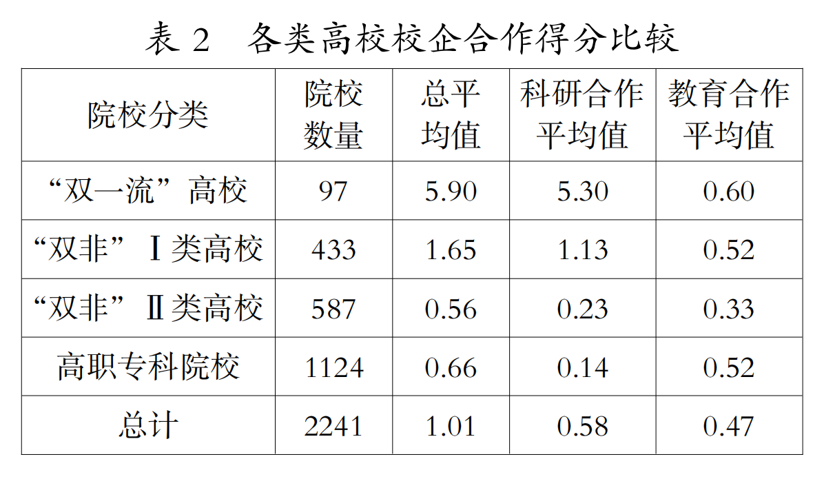 2.“双一流”高校科研合作平均值最高,高职专科院校最低