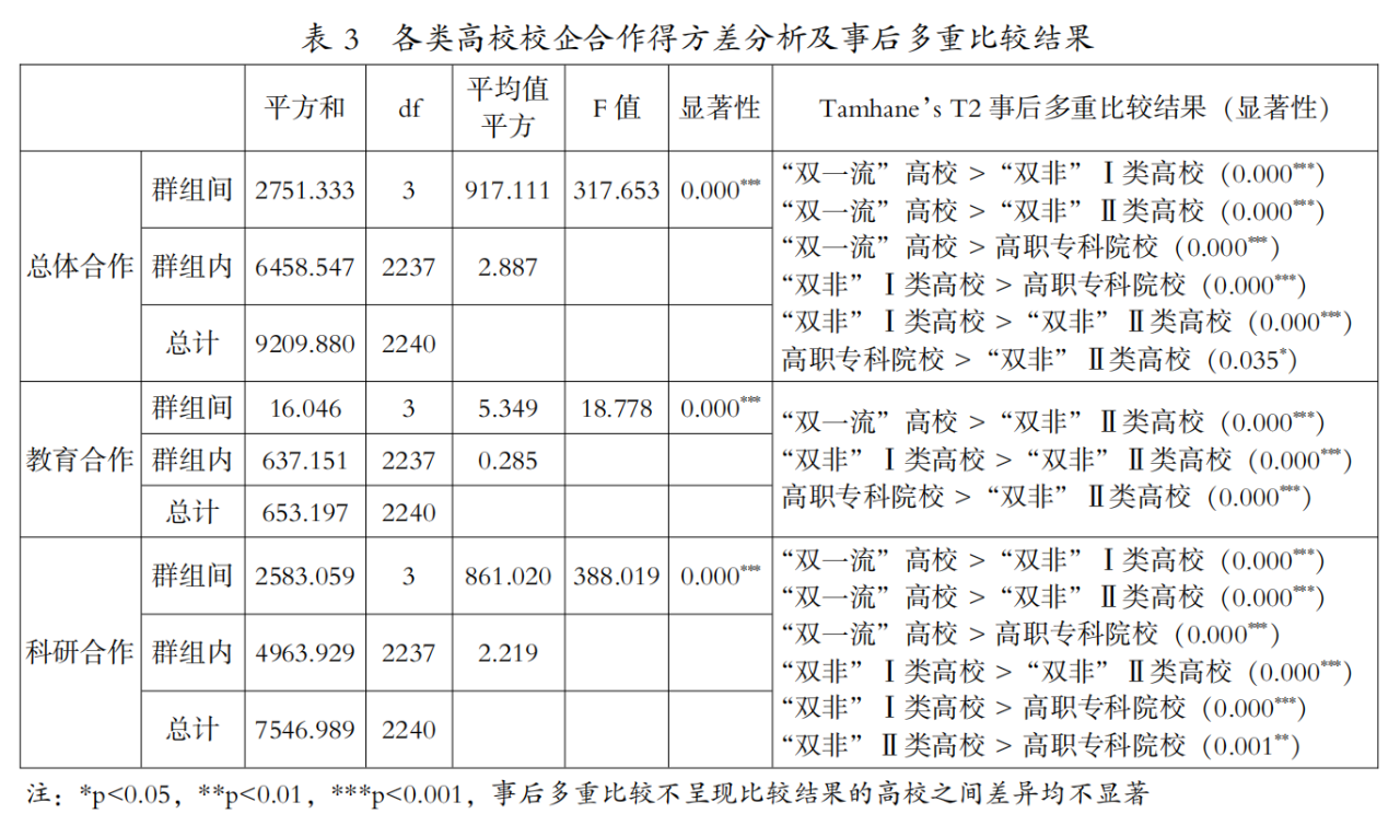 总体来看,所有高校校企合作总平均值为1.01分,最高值为35.42分。其中,“双一流”高校总平均值为5.90分,“双非”Ⅰ类高校为1.65分,高职专科院校为0.66分,“双非”Ⅱ类高校为0.56分(见表2)。单因素方差分析初步结果表明,四类高校的得分之间存在极其显著的差异(p<0.001),采用Tamhane’s T2法进行事后多重比较,结果表明“双一流”高校得分显著高于“双非”Ⅰ类高校(p<0.001),“双非”Ⅰ类高校得分显著高于高职专科院校(p<0.001),高职专科院校得分显著高于“双非”Ⅱ类高校(p<0.05)(见表3)。
