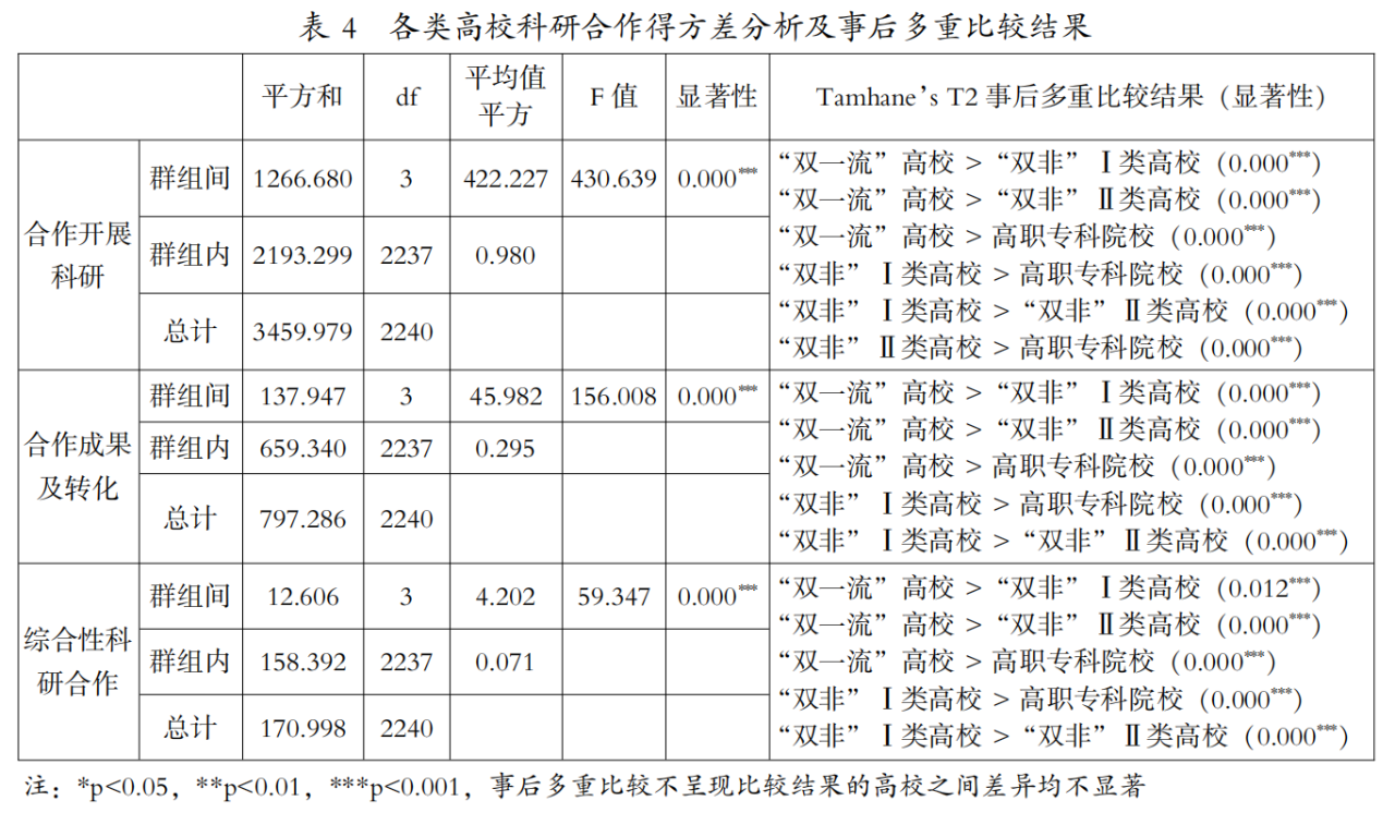 在科研合作方面,所有高校的平均值为0.58分,最高值为34.53分。其中,“双一流”高校的平均值为5.30分,“双非”Ⅰ类高校为1.13分,“双非”Ⅱ类高校为0.23分,高职专科院校为0.14分(见表2)。单因素方差分析初步结果表明,四类高校科研合作得分之间存在极其显著的差异(p<0.001),采用Tamhane’s T2法进行事后多重比较,结果表明“双一流”高校显著高于“双非”Ⅰ类高校(p<0.001),“双非”Ⅰ类高校显著高于“双非”Ⅱ类高校(p<0.001),“双非”Ⅱ类高校显著高于高职专科院校(p<0.01)(见表3)。从科研合作的内容来看,四类高校在合作开展科研、合作成果及转化、综合性科研合作方面的得分之间均存在极其显著的差异(p<0.001),可以看出,“双一流”高校三个方面的科研合作均显著高于其他三类高校,“双非”Ⅰ类高校三个方面的科研合作均显著高于“双非”Ⅱ类高校和高职专科院校,“双非”Ⅱ类高校在合作开展科研方面高于高职专科院校(见表4)。