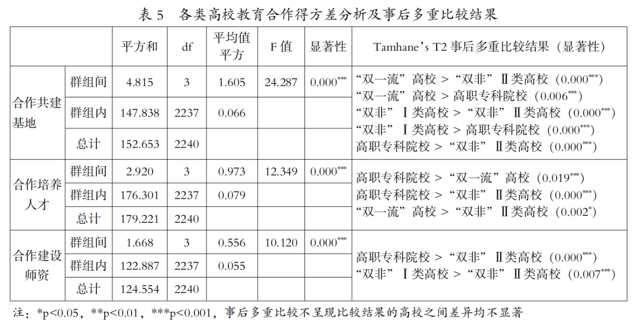 在教育合作方面,所有高校的平均值为0.47分,最高值为9.62分。其中,“双一流”高校的平均值为0.60分,“双非”Ⅰ类高校为0.52分,“双非”Ⅱ类高校为0.33分,高职专科院校为0.52分(见表2)。单因素方差分析初步结果表明,四类高校教育合作得分之间存在极其显著的差异(p<0.001),采用Tamhane’s T2法进行事后多重比较,结果表明“双一流”高校与“双非”Ⅰ类高校、高职专科院校的差异不显著(p>0.05),而三类高校均与“双非”Ⅱ类高校存在显著差异(p<0.001),即“双非”Ⅱ类高校显著低于其他三类高校(见表3)。从教育合作的内容来看,四类高校在合作共建基地、合作培养人才和合作建设师资方面的得分之间均存在极其显著的差异(p<0.001)。值得关注的是,高职专科院校在合作培养人才方面的优势较为明显,得分显著高于“双一流”高校和“双非”Ⅱ类高校,“双非”Ⅱ类高校在合作共建基地、合作培养人才和合作建设师资上均较落后(见表5)。从各高校教育合作得分分布情况可看出,“双一流”高校、“双非”Ⅰ类高校、“双非”Ⅱ类高校和高职专科院校仅各有15.4%、12.7%、4.8%和15.0%的学校得分在1分以上,表明多数高校教育合作力度不够。相比较而言,“双非”Ⅱ类高校教育合作最为薄弱。