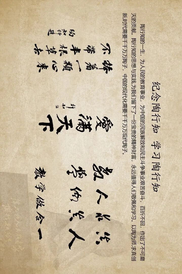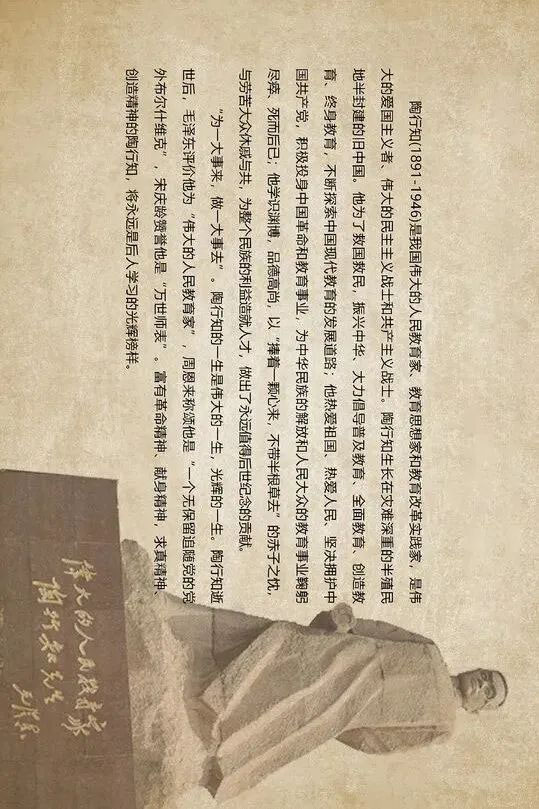 他以“我是中国人,我爱中华国”和“使全中国人都受到教育”的兼爱之心,和“捧着一颗心来,不带半根草去”的赤子之忱,为中国教育探寻新路,推动平民教育、乡村教育,以“从爱里产生出来的”晓庄学校为起点,30年矢志不移,被誉为“伟大的人民教育家”、“万世师表”、“两千年前孔仲尼,两千年后陶行知”。
