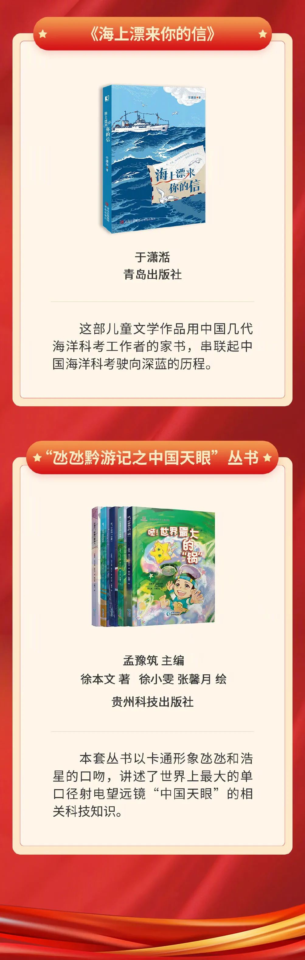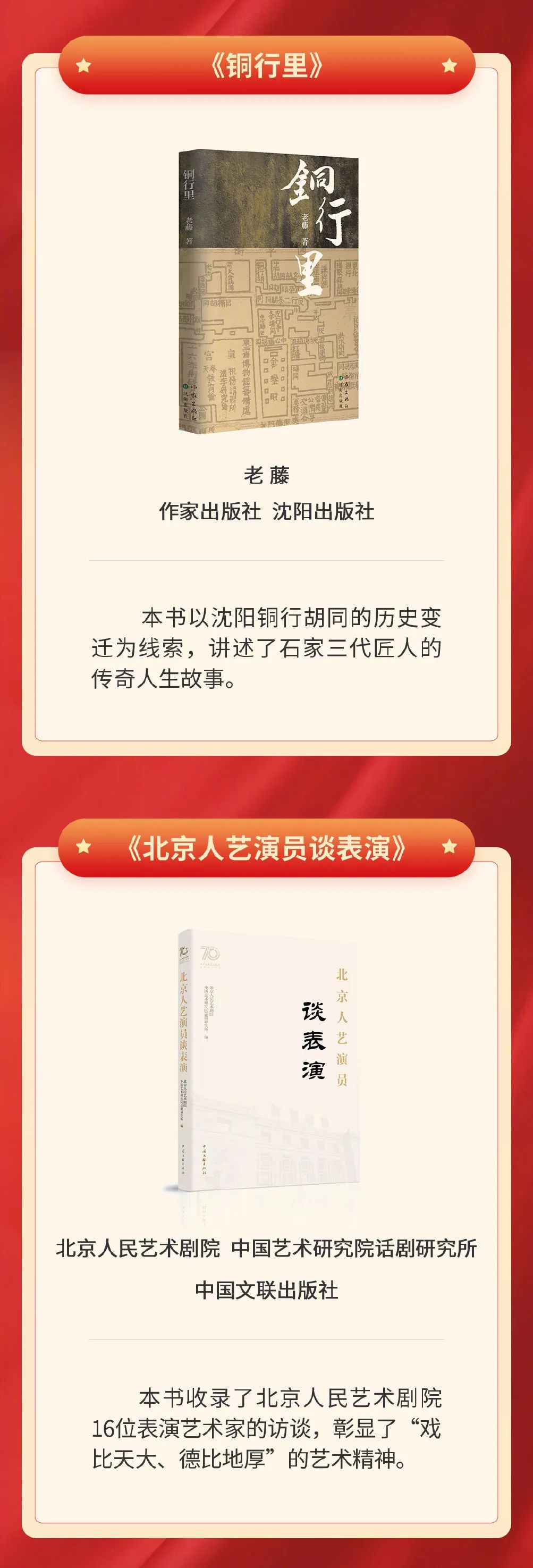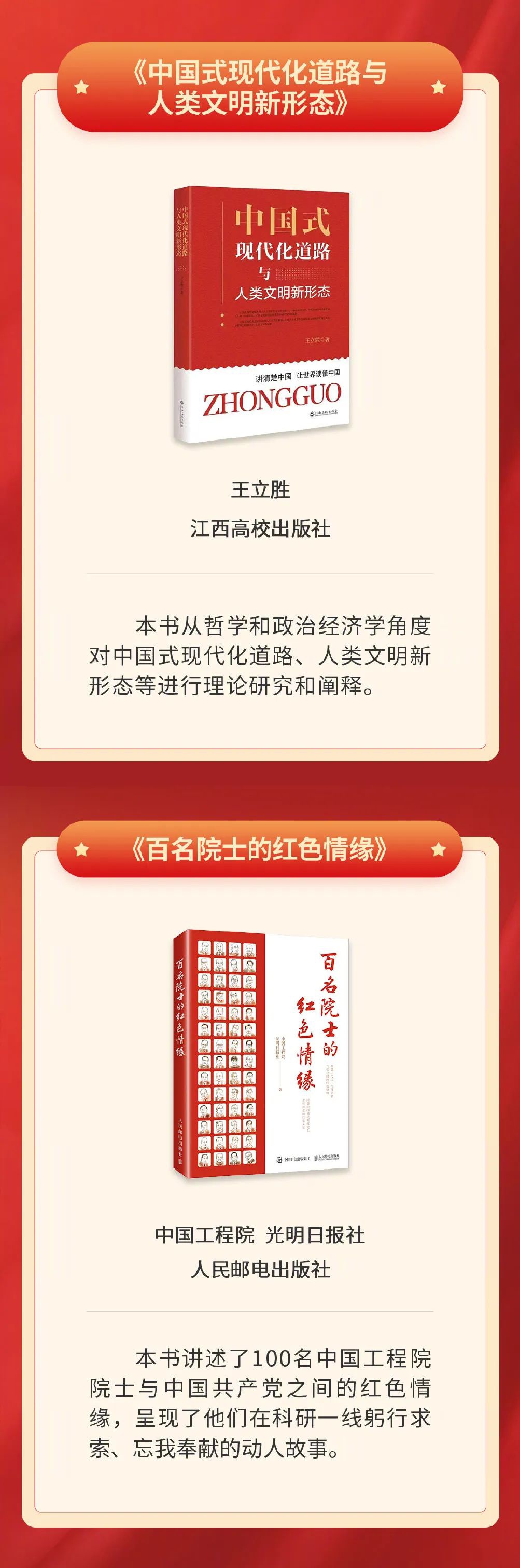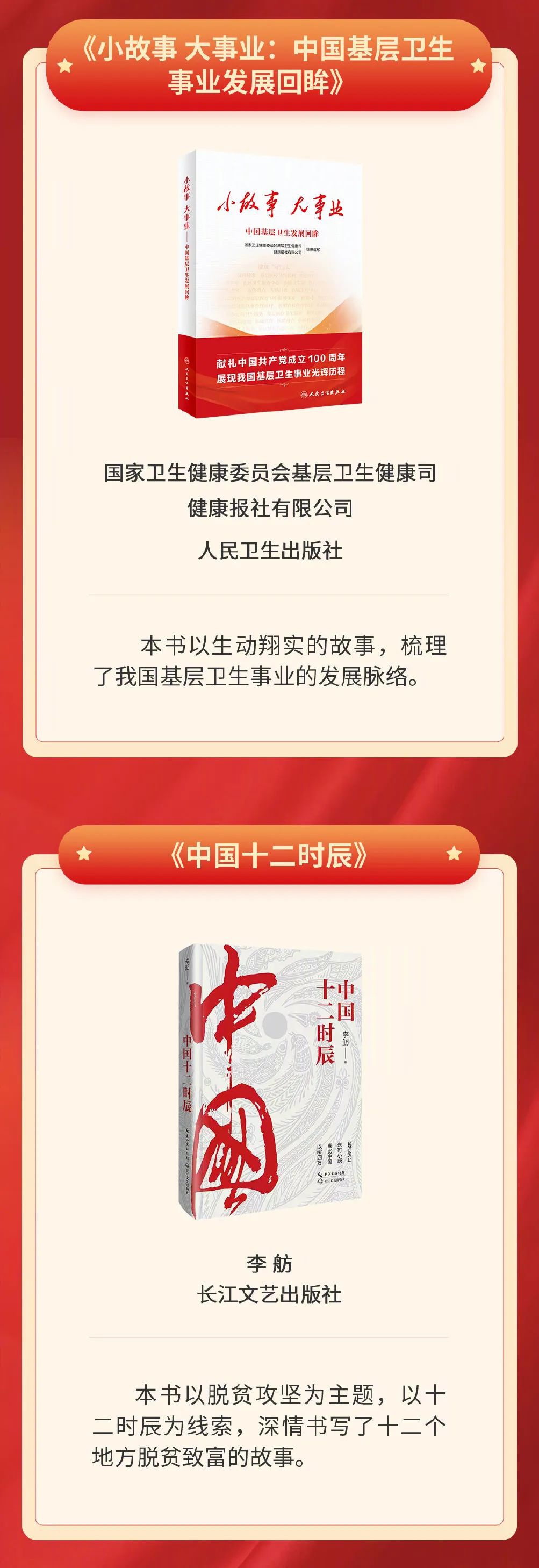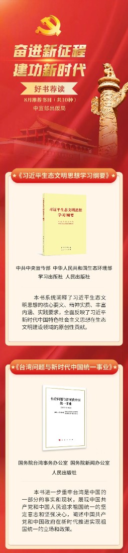 8月26日,中宣部出版局“奋进新征程 建功新时代”好书荐读活动公布8月书单,包含讲述100名中国工程院院士科技报国、忘我奉献故事的《百名院士的红色情缘》,以十二时辰为线索、深情书写12个地方脱贫致富历程的《中国十二时辰》,汇集蓝天野等16位北京人艺演员实践结晶与艺术心得的《北京人艺演员谈表演》等10种图书。