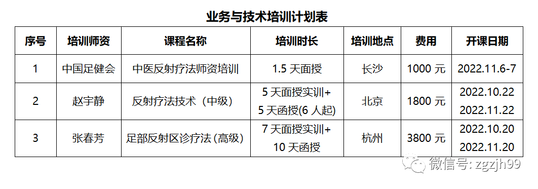1、业务培训主要包括中医反射疗法师资培训。技术培训主要包括中高级足反射疗法培训,详见计划表。