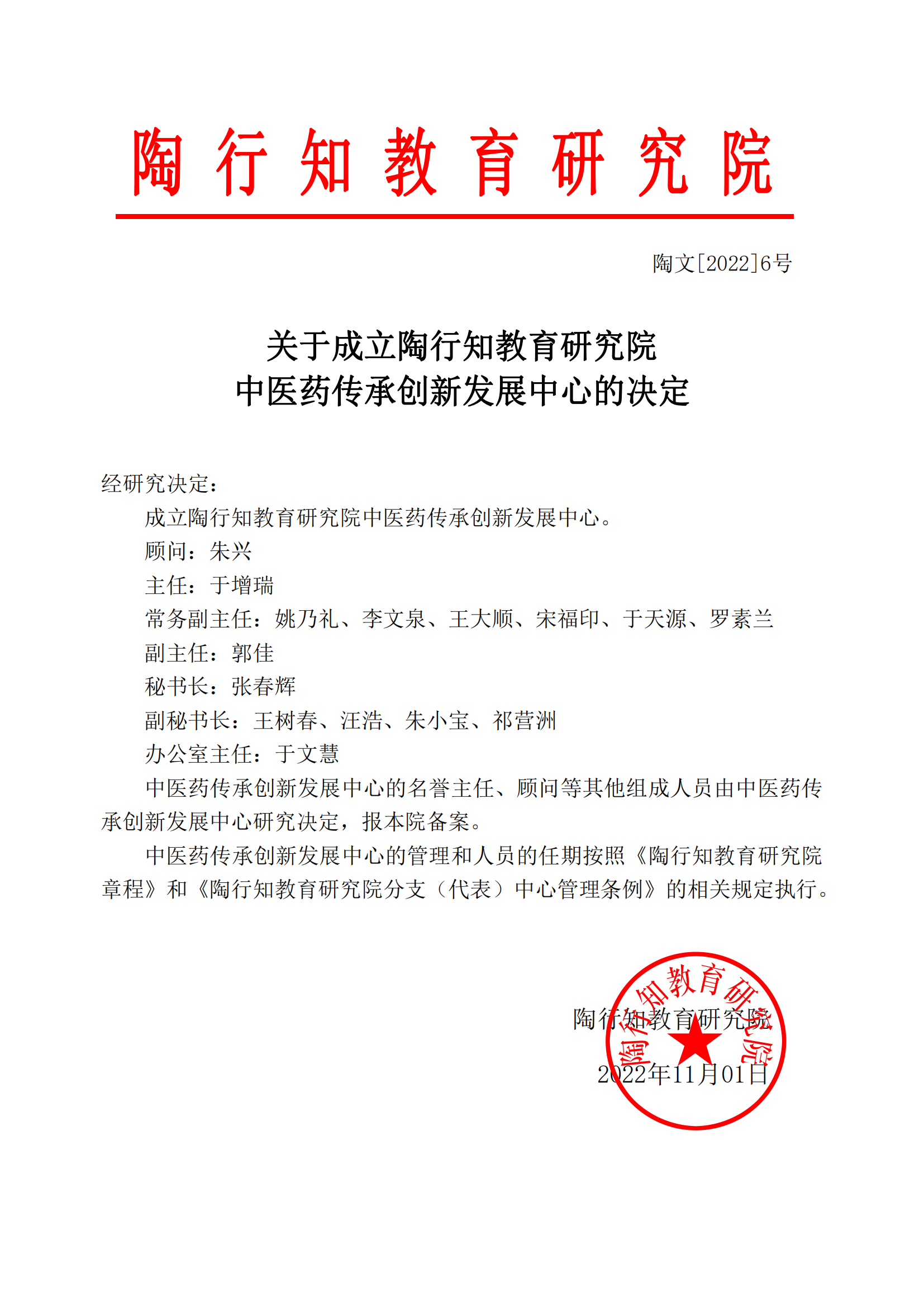 关于成立陶行知教育研究院中医药传承创新发展中心的决定